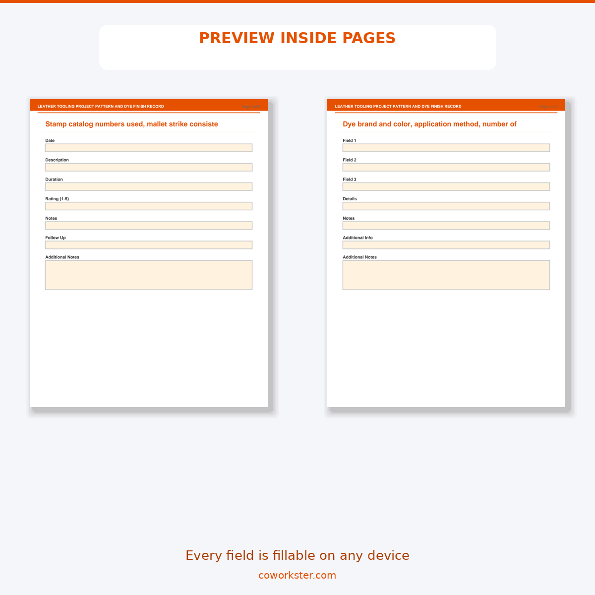 If you have been looking for a leather tooling project pattern and dye finish record that actually works the way you need it to, this is it. We designed this 5 page fillable PDF specifically for Leather crafters and Western saddle makers who want something practical, organized, and ready to use right away.