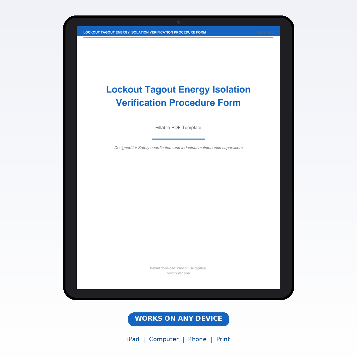 If you have been looking for a lockout tagout energy isolation verification procedure form that actually works the way you need it to, this is it. We designed this 5 page fillable PDF specifically for Safety coordinators and industrial maintenance supervisors who want something practical, organized, and ready to use right away.