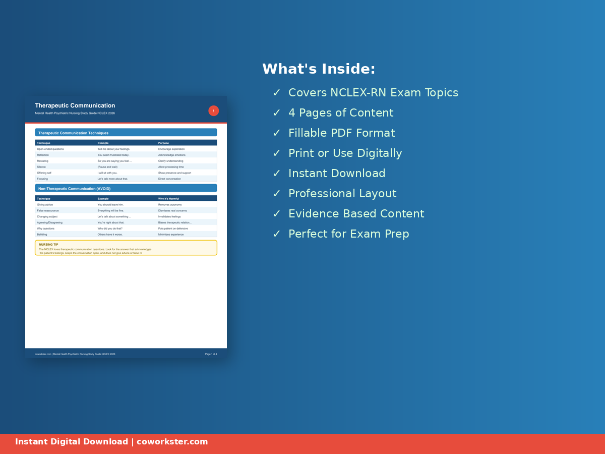 This digital download includes 4 professionally designed pages covering Therapeutic Communication, Anxiety and Mood Disorders, Psychotic Disorders and Personality Disorders, and Crisis Intervention and Safety. Every page features a clean, color coded layout that makes complex nursing concepts easy to scan and review. The fillable PDF format means you can type directly into the document on your computer, tablet, or phone, or print it out and write by hand. Either way, you have a study tool that works the way you study.
