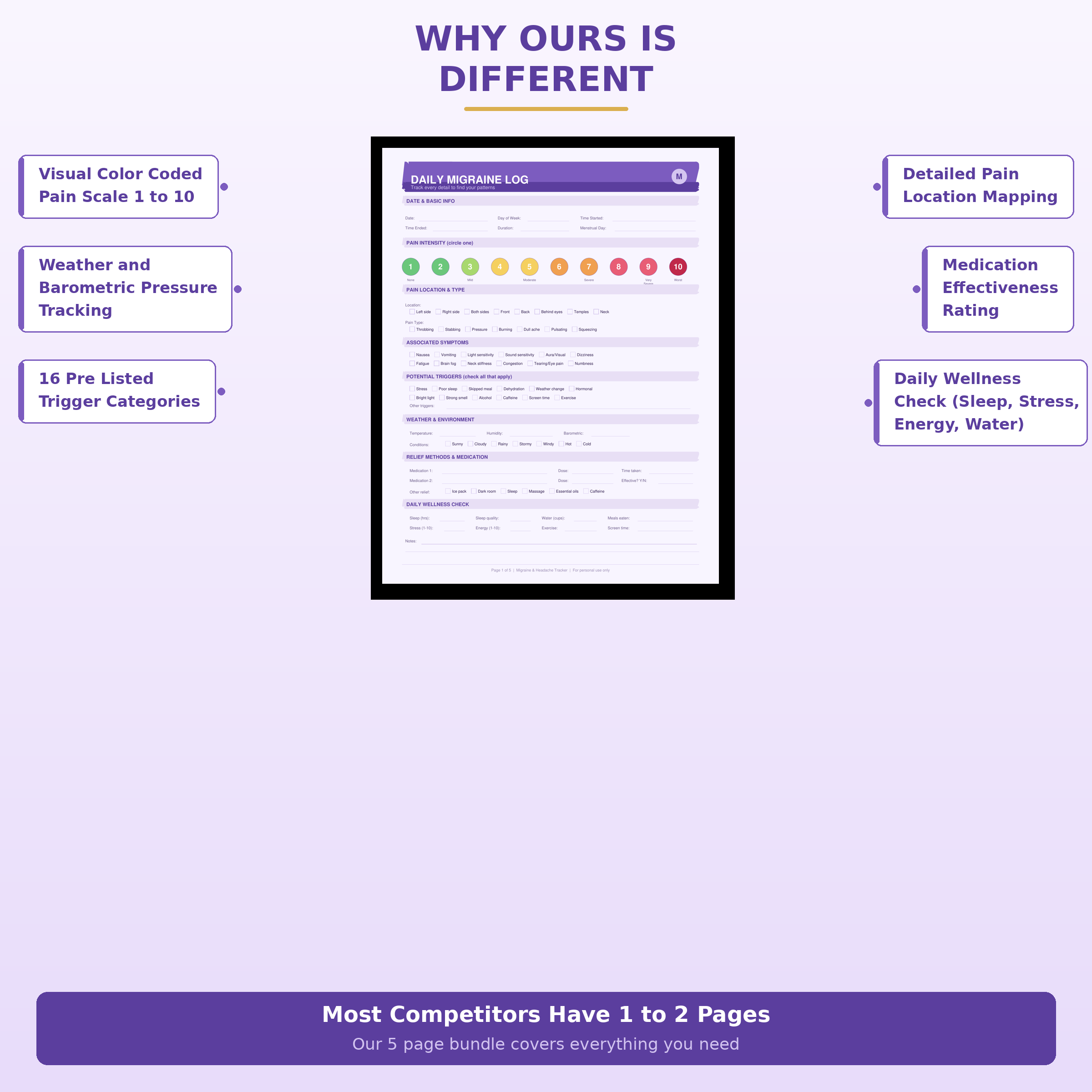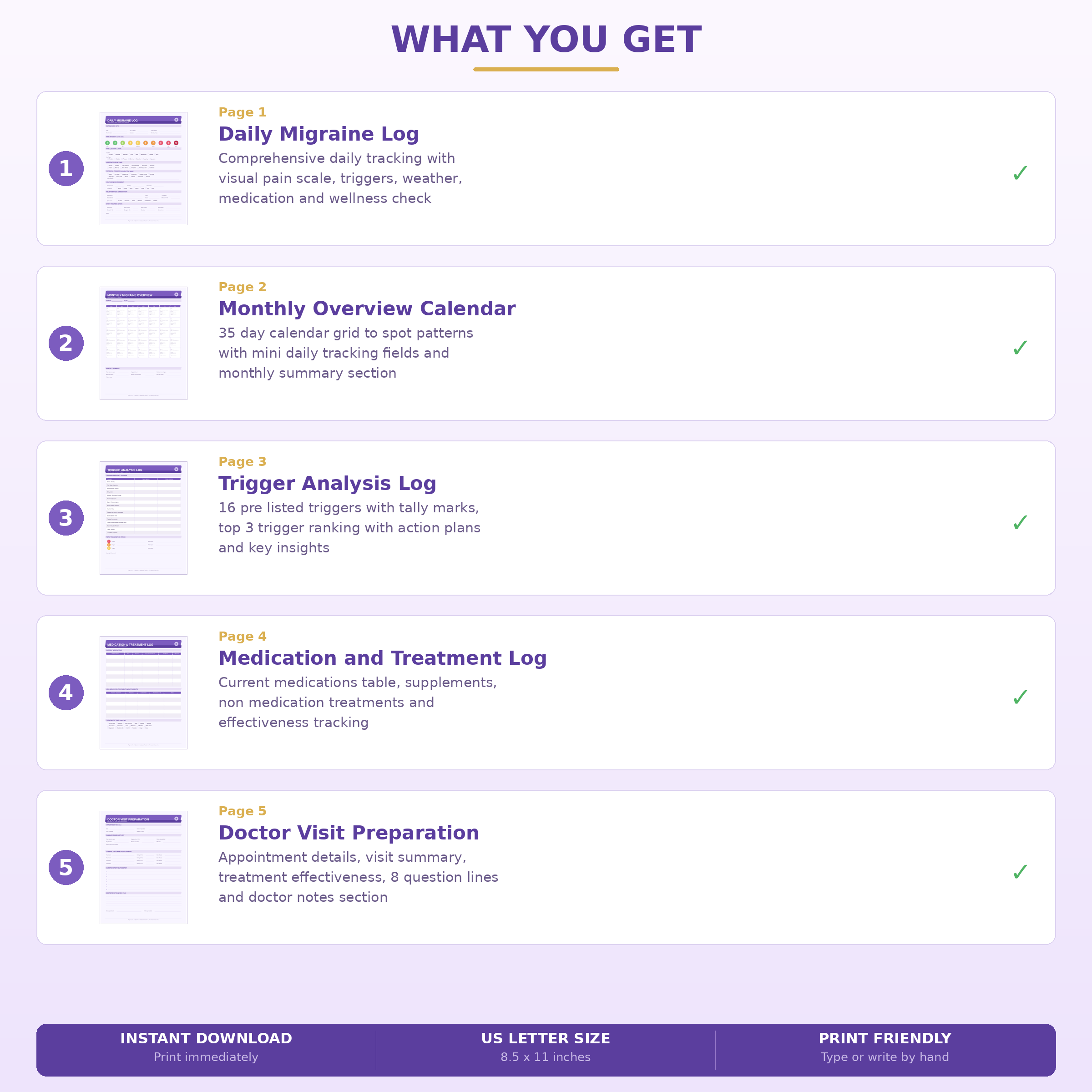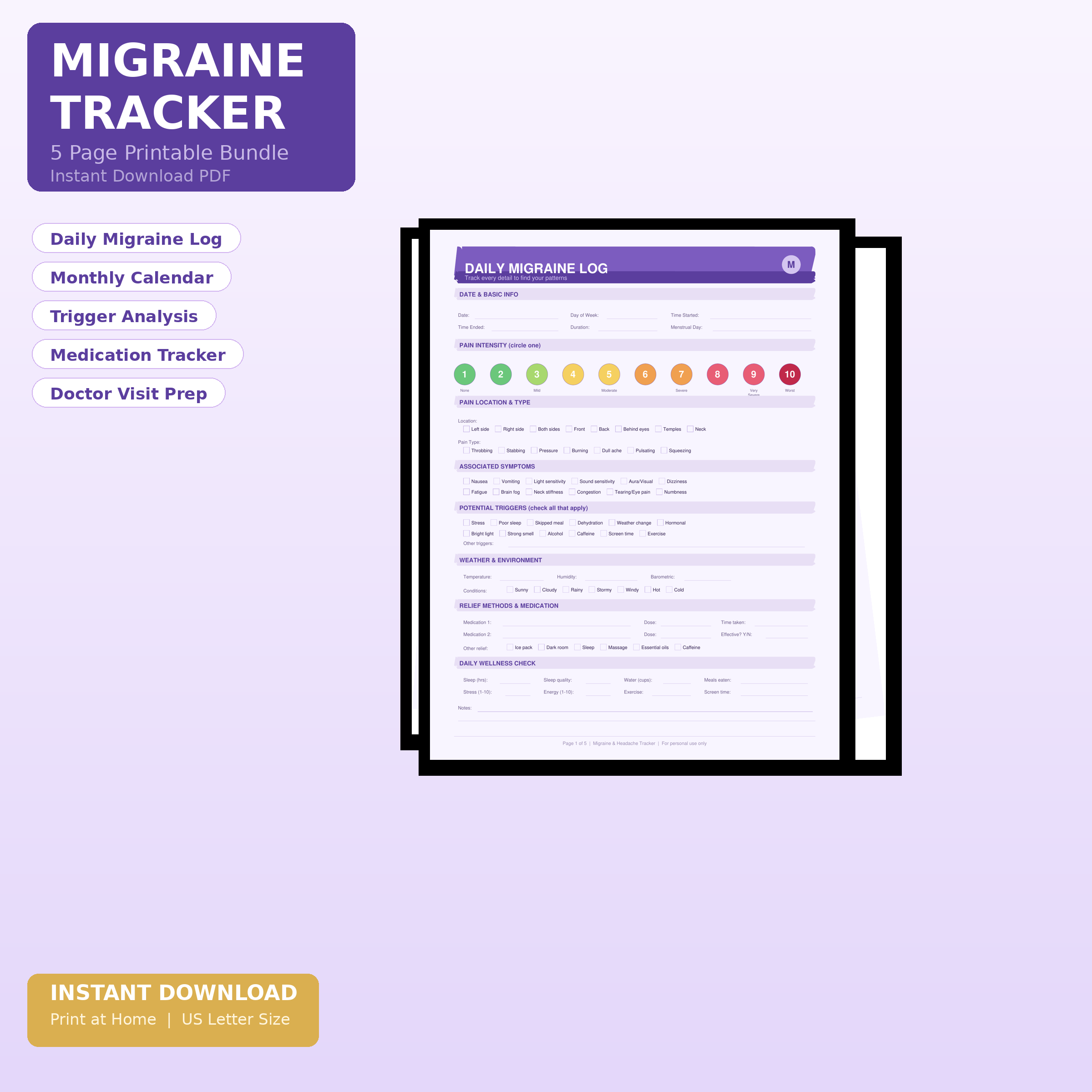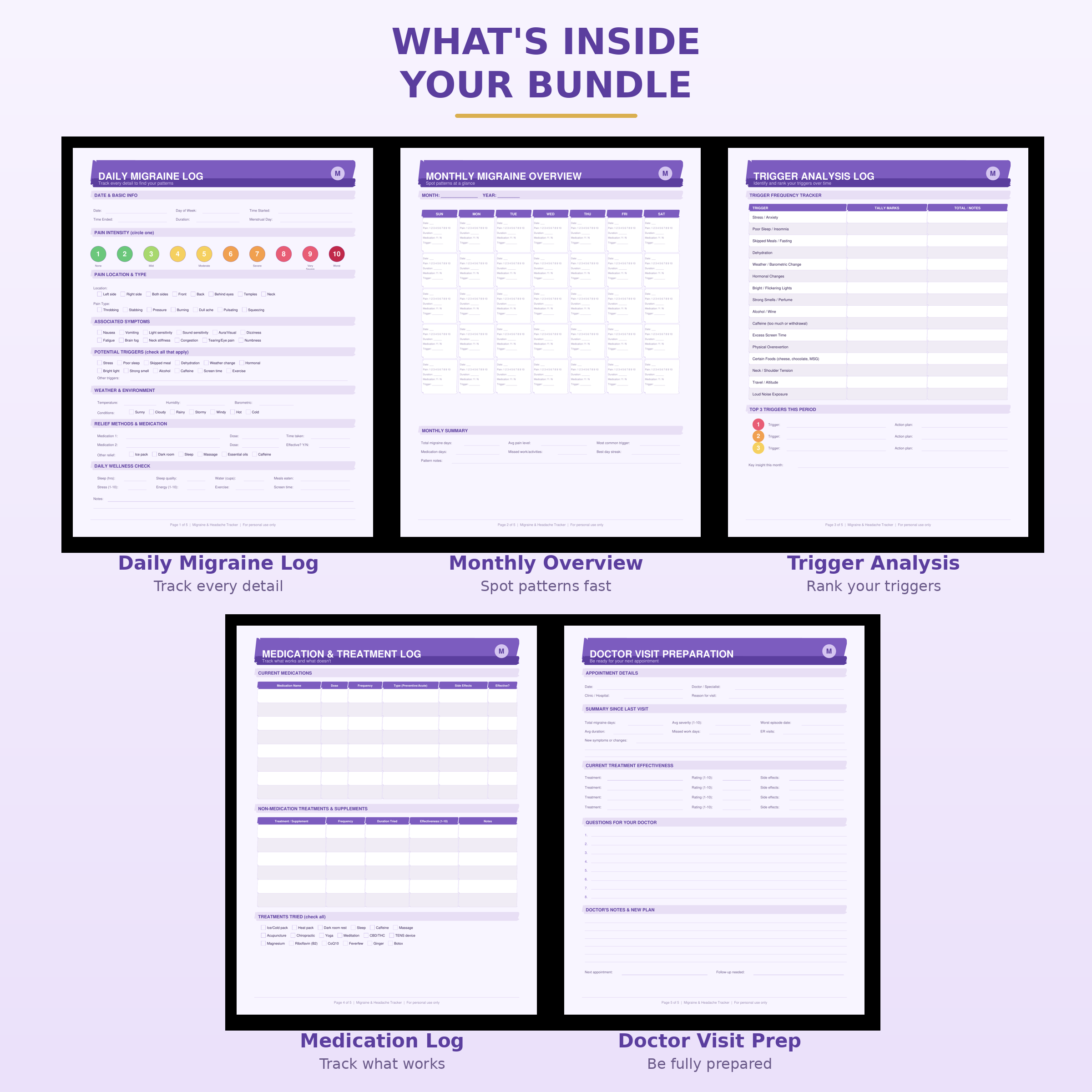 Don’t need a full-year planner? This 5-Page Migraine Tracker Bundle gives you everything you need to start identifying your migraine patterns — without the overwhelm. Print, fill in, and bring organized data to your next doctor appointment.