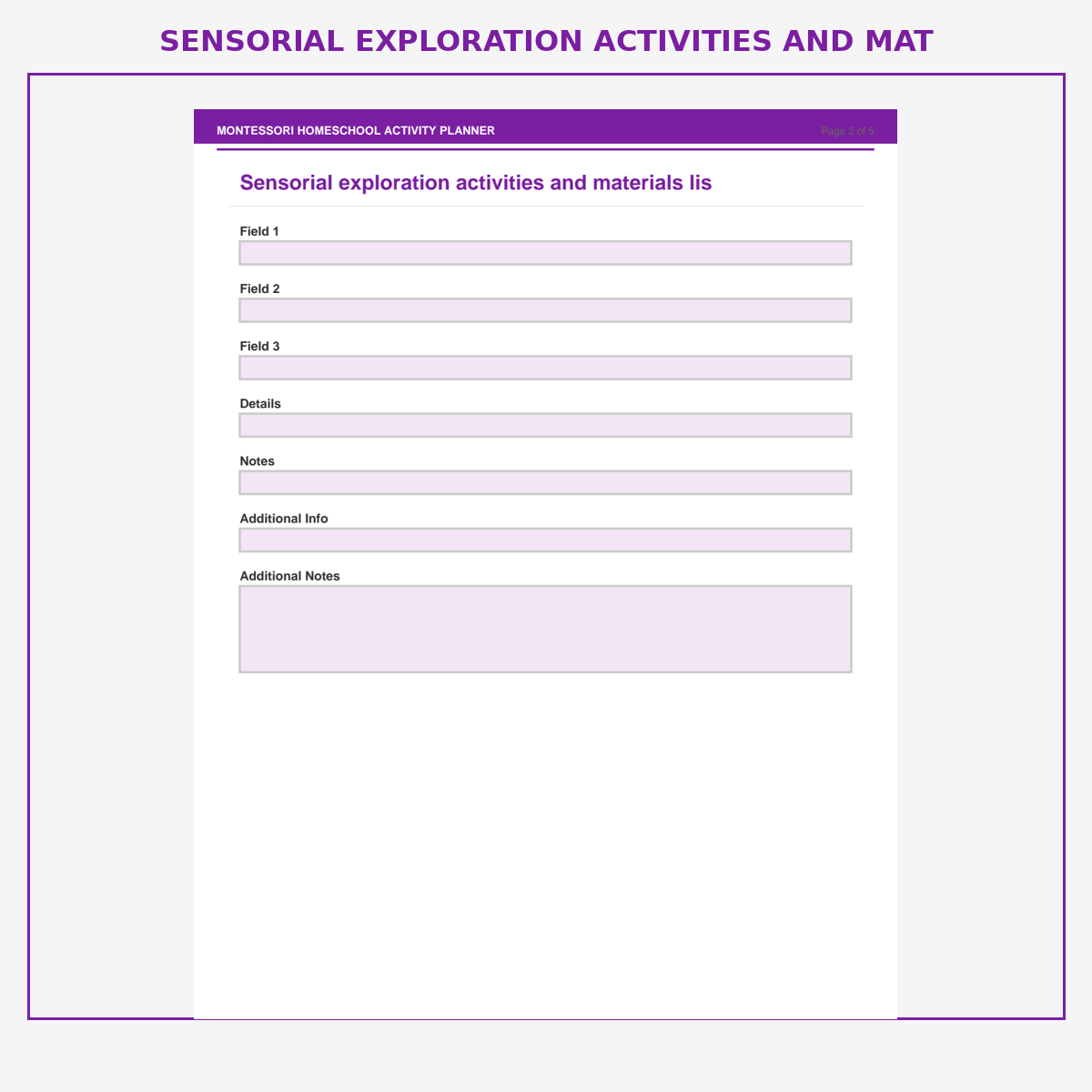 Sensorial exploration activities and materials list