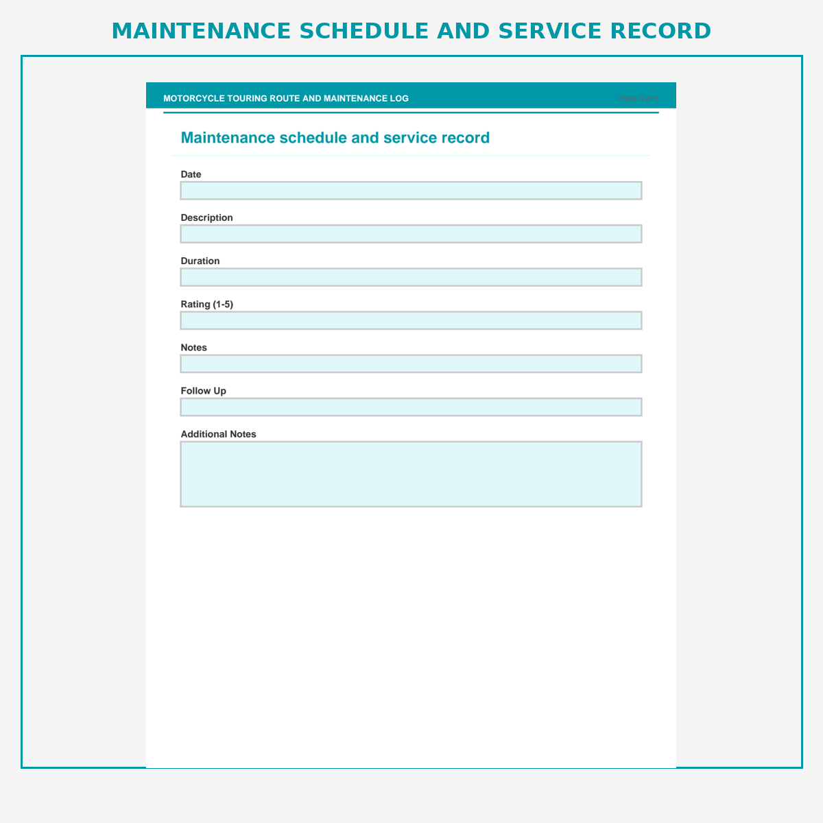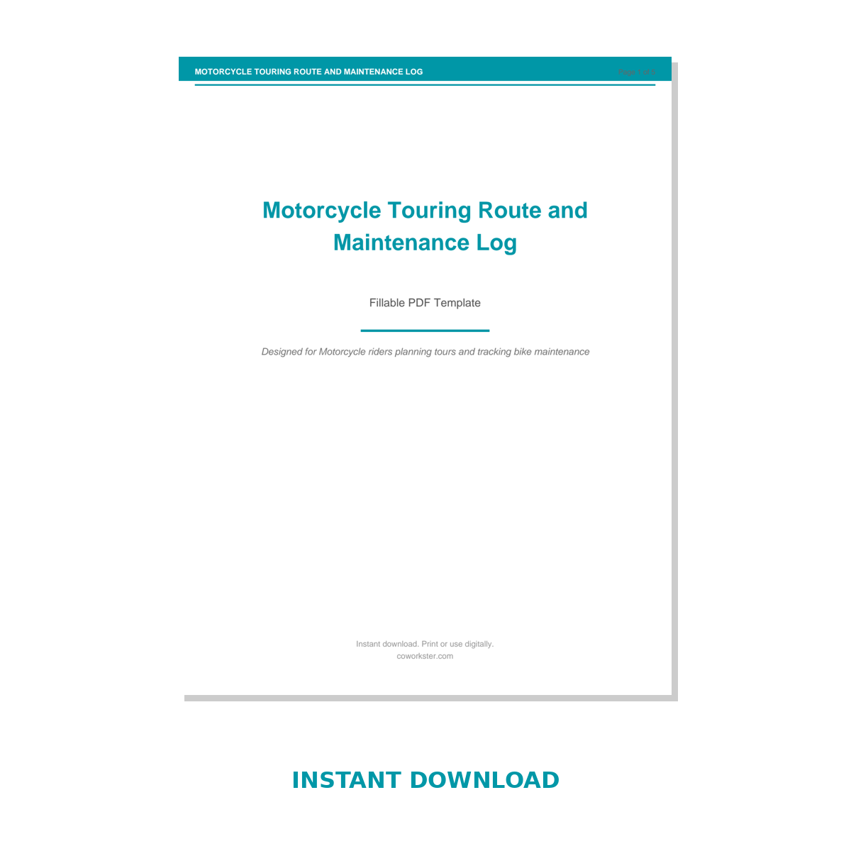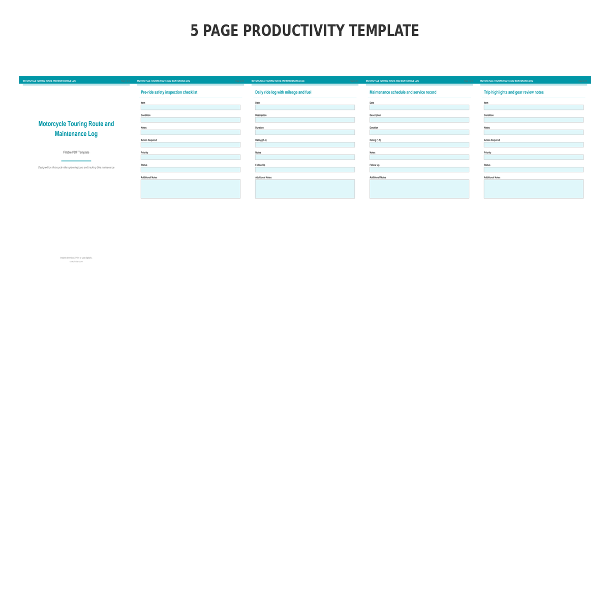A 5 page fillable PDF template designed for Motorcycle riders planning tours and tracking bike maintenance. Covers everything you need in one organized, professional document. Just open it, fill in the fields, and you are ready to go. Works on any device or print it out.