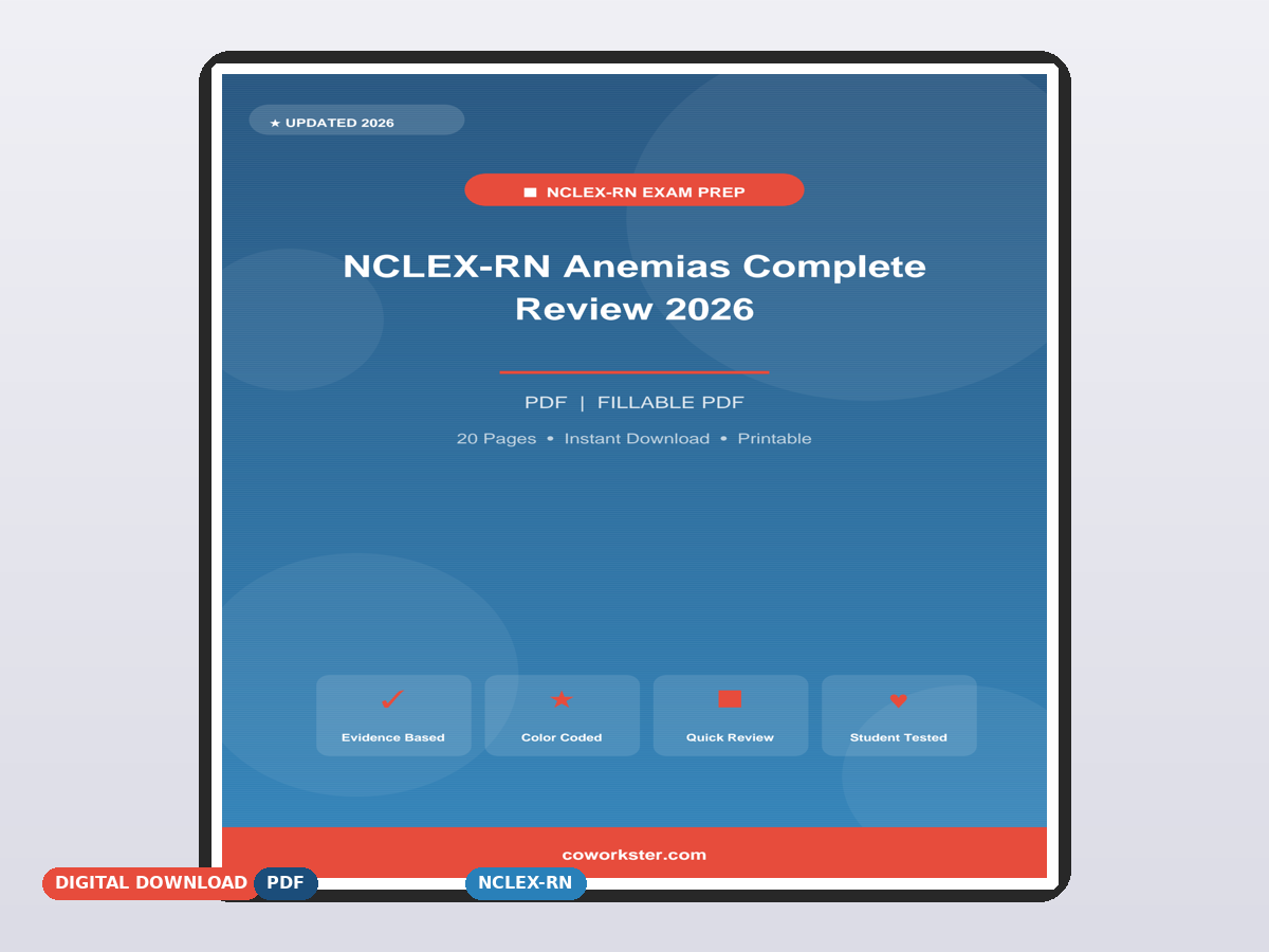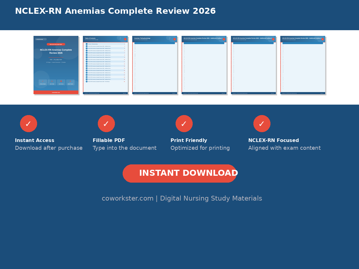 This digital download includes 20 professionally designed pages covering Anemias: Pathophysiology, NCLEX-RN Anemias Complete Review 2026 – Additional Content 1, NCLEX-RN Anemias Complete Review 2026 – Additional Content 2, NCLEX-RN Anemias Complete Review 2026 – Additional Content 3, NCLEX-RN Anemias Complete Review 2026 – Additional Content 4, NCLEX-RN Anemias Complete Review 2026 – Additional Content 5, NCLEX-RN Anemias Complete Review 2026 – Additional Content 6, NCLEX-RN Anemias Complete Review 2026 – Additional Content 7, NCLEX-RN Anemias Complete Review 2026 – Additional Content 8, NCLEX-RN Anemias Complete Review 2026 – Additional Content 9, NCLEX-RN Anemias Complete Review 2026 – Additional Content 10, NCLEX-RN Anemias Complete Review 2026 – Additional Content 11, NCLEX-RN Anemias Complete Review 2026 – Additional Content 12, NCLEX-RN Anemias Complete Review 2026 – Additional Content 13, NCLEX-RN Anemias Complete Review 2026 – Additional Content 14, NCLEX-RN Anemias Complete Review 2026 – Additional Content 15, NCLEX-RN Anemias Complete Review 2026 – Additional Content 16, and NCLEX-RN Anemias Complete Review 2026 – Final Review. Every page features a clean, color coded layout that makes complex nursing concepts easy to scan and review. The fillable PDF format means you can type directly into the document on your computer, tablet, or phone, or print it out and write by hand. Either way, you have a study tool that works the way you study.