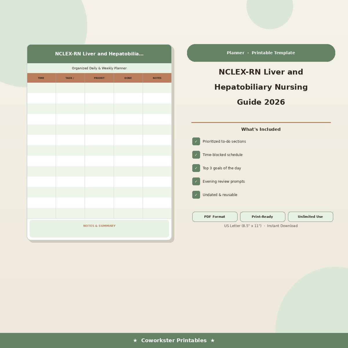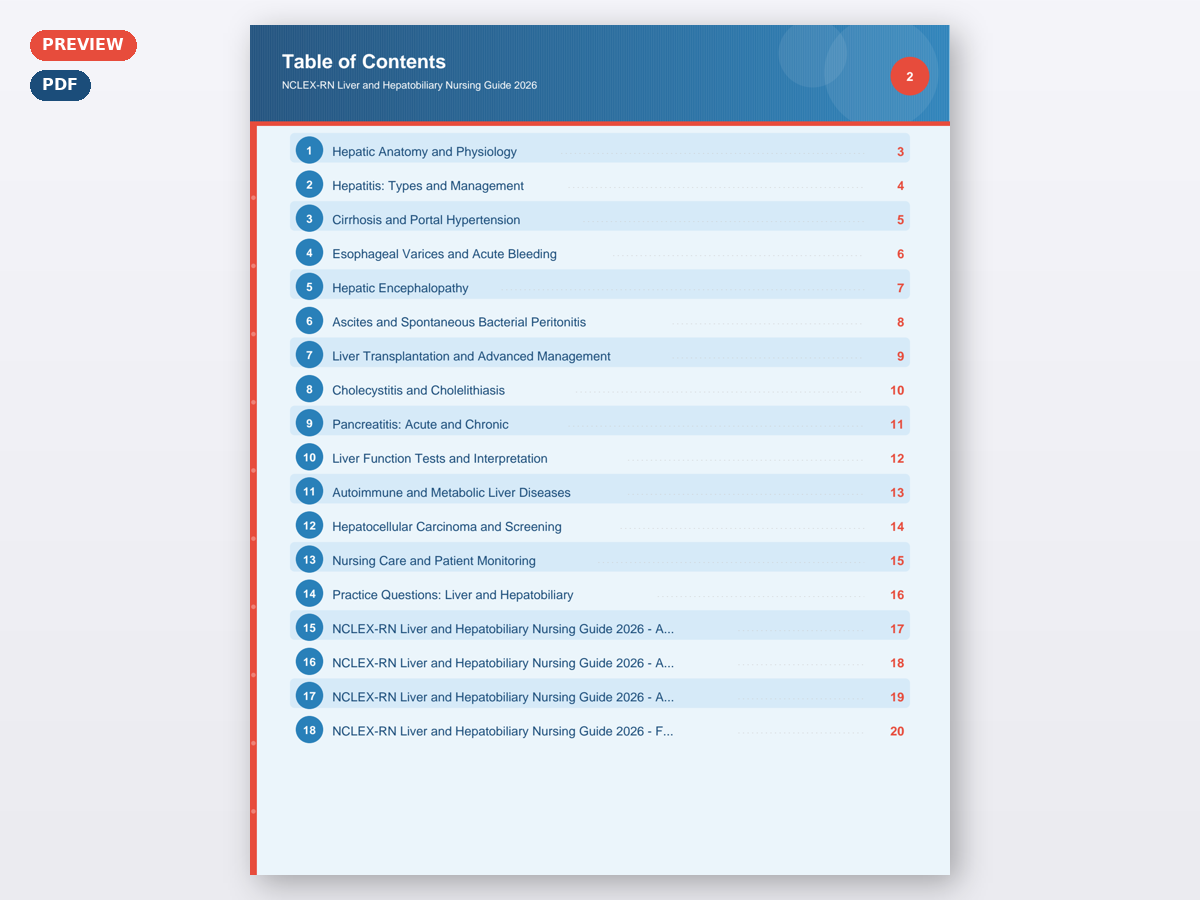 This digital download includes 20 professionally designed pages covering Hepatic Anatomy and Physiology, Hepatitis: Types and Management, Cirrhosis and Portal Hypertension, Esophageal Varices and Acute Bleeding, Hepatic Encephalopathy, Ascites and Spontaneous Bacterial Peritonitis, Liver Transplantation and Advanced Management, Cholecystitis and Cholelithiasis, Pancreatitis: Acute and Chronic, Liver Function Tests and Interpretation, Autoimmune and Metabolic Liver Diseases, Hepatocellular Carcinoma and Screening, Nursing Care and Patient Monitoring, Practice Questions: Liver and Hepatobiliary, NCLEX-RN Liver and Hepatobiliary Nursing Guide 2026 – Additional Content 1, NCLEX-RN Liver and Hepatobiliary Nursing Guide 2026 – Additional Content 2, NCLEX-RN Liver and Hepatobiliary Nursing Guide 2026 – Additional Content 3, and NCLEX-RN Liver and Hepatobiliary Nursing Guide 2026 – Final Review. Every page features a clean, color coded layout that makes complex nursing concepts easy to scan and review. The fillable PDF format means you can type directly into the document on your computer, tablet, or phone, or print it out and write by hand. Either way, you have a study tool that works the way you study.