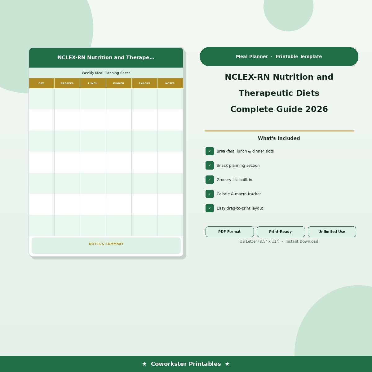 This digital download includes 18 professionally designed pages covering Macronutrients: Carbohydrates, Proteins, and Fats, Micronutrients: Vitamins and Minerals, Nutritional Assessment and Anthropometrics, Calorie Requirements and Estimation, Enteral Nutrition: Tube Feeding, Parenteral Nutrition: TPN Composition, Therapeutic Diets: Cardiac and Renal, Therapeutic Diets: Digestive Disorders, Food-Drug Interactions and Considerations, Cultural and Dietary Considerations, Pediatric Nutrition and Growth, Geriatric Nutrition and Special Considerations, Eating Disorders: Nutritional Management, Nutritional Support in Special Populations, Practice Questions Set 1, and Practice Questions Set 2. Every page features a clean, color coded layout that makes complex nursing concepts easy to scan and review. The fillable PDF format means you can type directly into the document on your computer, tablet, or phone, or print it out and write by hand. Either way, you have a study tool that works the way you study.