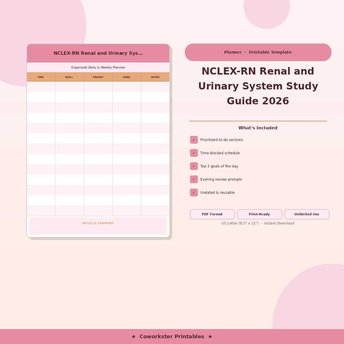 This digital download includes 16 professionally designed pages covering Kidney Anatomy and Physiology, Renal Assessment, UTI and Pyelonephritis, Glomerulonephritis and Nephrotic Syndrome, Acute Kidney Injury, Chronic Kidney Disease Stages, Dialysis: Hemodialysis vs Peritoneal, Kidney Transplant, Nephrolithiasis and Bladder Cancer, BPH and Urinary Catheter Care, Renal Medications, Practice Questions Part 1, Practice Questions Part 2, and Quick Reference – Renal. Every page features a clean, color coded layout that makes complex nursing concepts easy to scan and review. The fillable PDF format means you can type directly into the document on your computer, tablet, or phone, or print it out and write by hand. Either way, you have a study tool that works the way you study.