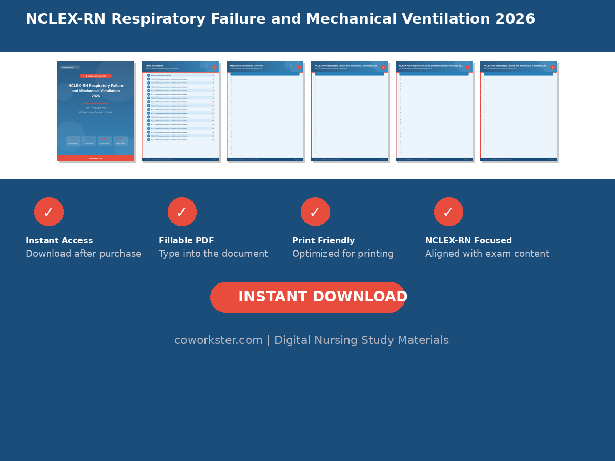This digital download includes 20 professionally designed pages covering Mechanical Ventilation Overview, NCLEX-RN Respiratory Failure and Mechanical Ventilation 2026 – Additional Content 1, NCLEX-RN Respiratory Failure and Mechanical Ventilation 2026 – Additional Content 2, NCLEX-RN Respiratory Failure and Mechanical Ventilation 2026 – Additional Content 3, NCLEX-RN Respiratory Failure and Mechanical Ventilation 2026 – Additional Content 4, NCLEX-RN Respiratory Failure and Mechanical Ventilation 2026 – Additional Content 5, NCLEX-RN Respiratory Failure and Mechanical Ventilation 2026 – Additional Content 6, NCLEX-RN Respiratory Failure and Mechanical Ventilation 2026 – Additional Content 7, NCLEX-RN Respiratory Failure and Mechanical Ventilation 2026 – Additional Content 8, NCLEX-RN Respiratory Failure and Mechanical Ventilation 2026 – Additional Content 9, NCLEX-RN Respiratory Failure and Mechanical Ventilation 2026 – Additional Content 10, NCLEX-RN Respiratory Failure and Mechanical Ventilation 2026 – Additional Content 11, NCLEX-RN Respiratory Failure and Mechanical Ventilation 2026 – Additional Content 12, NCLEX-RN Respiratory Failure and Mechanical Ventilation 2026 – Additional Content 13, NCLEX-RN Respiratory Failure and Mechanical Ventilation 2026 – Additional Content 14, NCLEX-RN Respiratory Failure and Mechanical Ventilation 2026 – Additional Content 15, NCLEX-RN Respiratory Failure and Mechanical Ventilation 2026 – Additional Content 16, and NCLEX-RN Respiratory Failure and Mechanical Ventilation 2026 – Final Review. Every page features a clean, color coded layout that makes complex nursing concepts easy to scan and review. The fillable PDF format means you can type directly into the document on your computer, tablet, or phone, or print it out and write by hand. Either way, you have a study tool that works the way you study.