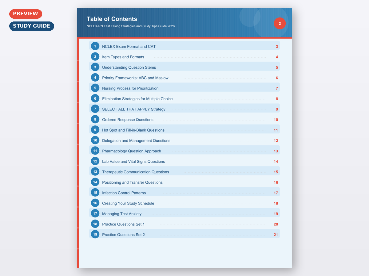 This digital download includes 21 professionally designed pages covering NCLEX Exam Format and CAT, Item Types and Formats, Understanding Question Stems, Priority Frameworks: ABC and Maslow, Nursing Process for Prioritization, Elimination Strategies for Multiple Choice, SELECT ALL THAT APPLY Strategy, Ordered Response Questions, Hot Spot and Fill-in-Blank Questions, Delegation and Management Questions, Pharmacology Question Approach, Lab Value and Vital Signs Questions, Therapeutic Communication Questions, Positioning and Transfer Questions, Infection Control Patterns, Creating Your Study Schedule, Managing Test Anxiety, Practice Questions Set 1, and Practice Questions Set 2. Every page features a clean, color coded layout that makes complex nursing concepts easy to scan and review. The fillable PDF format means you can type directly into the document on your computer, tablet, or phone, or print it out and write by hand. Either way, you have a study tool that works the way you study.