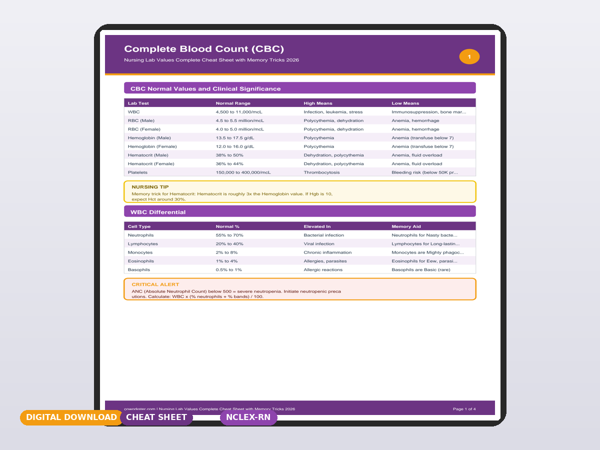 Studying for NCLEX-RN can feel overwhelming, but having the right study materials makes all the difference. This cheat sheet was created specifically for nursing students learning critical lab values who want a clear, organized, and comprehensive resource they can actually use. Whether you are reviewing for the first time or doing a final cram session, this 4 page fillable PDF gives you exactly what you need in one place.