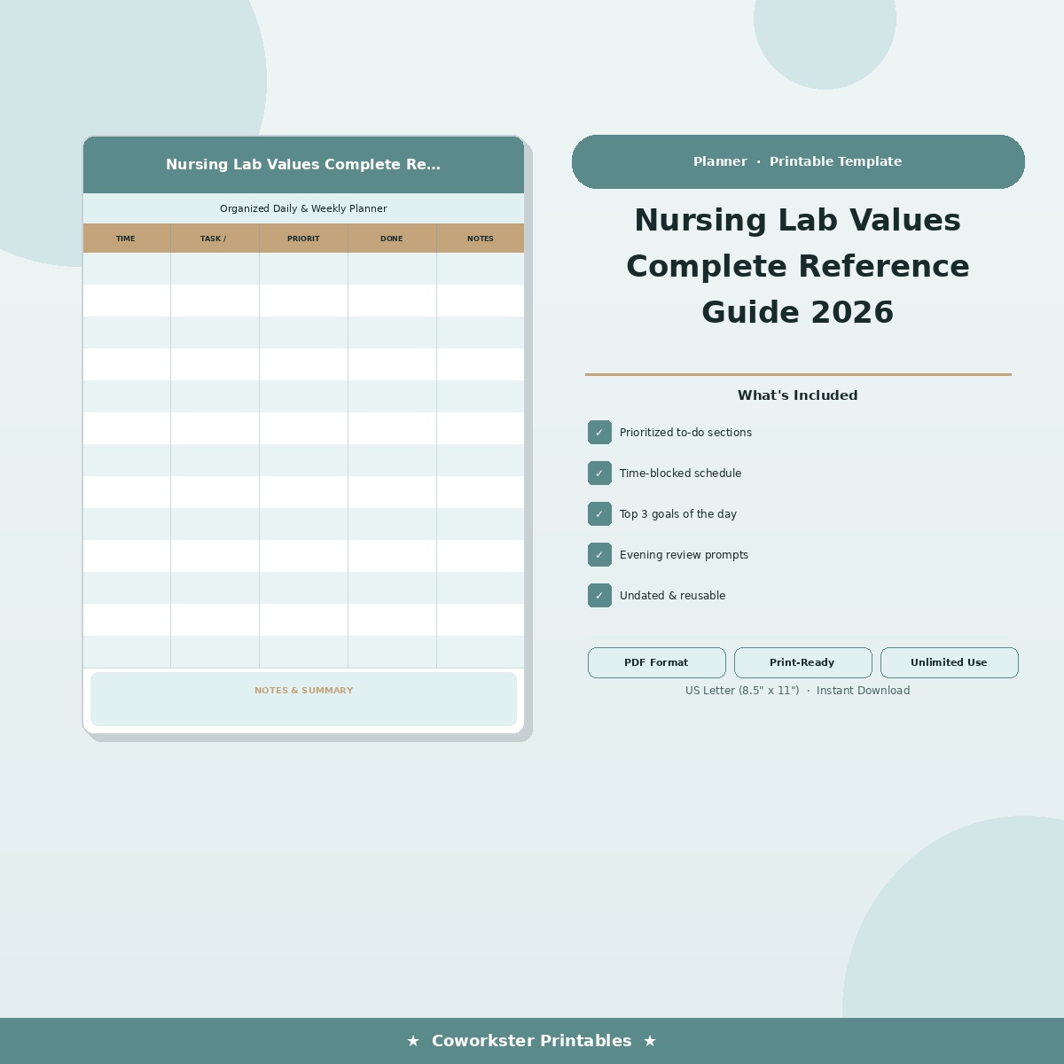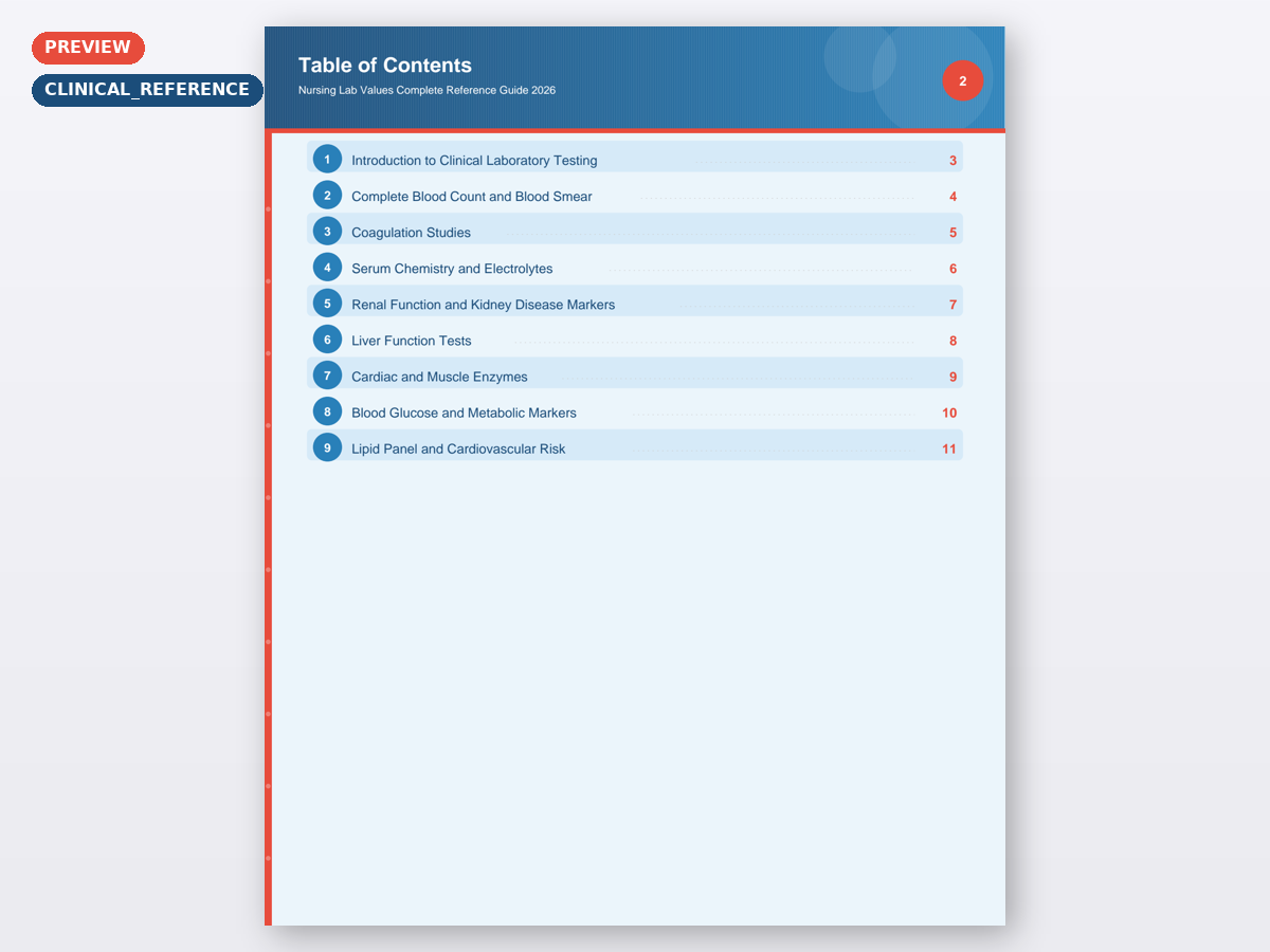 Studying for lab_values can feel overwhelming, but having the right study materials makes all the difference. This clinical_reference was created specifically for Nursing students and RNs needing quick reference for common laboratory values and their clinical significance who want a clear, organized, and comprehensive resource they can actually use. Whether you are reviewing for the first time or doing a final cram session, this 11 page fillable PDF gives you exactly what you need in one place.