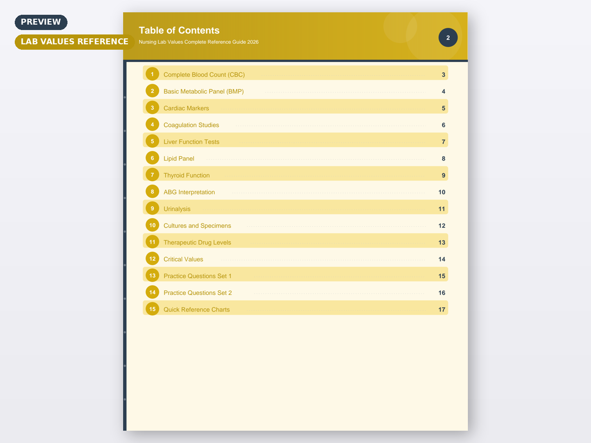 Nursing school throws a mountain of information at you, and knowing what to focus on is half the battle. This lab values reference organizes the most important concepts, values, and clinical details into a format that is easy to digest and actually helps you retain information. No more flipping through hundreds of textbook pages or trying to decode messy lecture notes. Everything is laid out clearly with visual cues, key points highlighted, and critical alerts called out so you never miss what matters most.