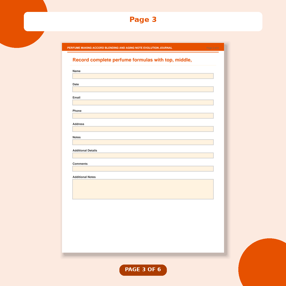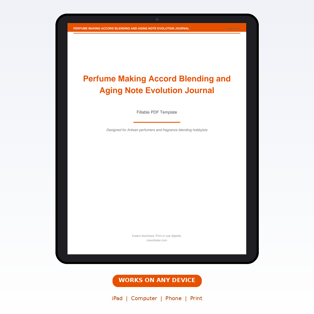 A [‘Raw Material Inventory’, ‘Accord Building Record’, ‘Formula Documentation’, ‘Aging Observation Journal’, ‘Skin Test Record’, ‘Final Evaluation Sheet’] page fillable PDF template designed for Artisan perfumers and fragrance blending hobbyists. Covers everything you need in one organized, professional document. Just open it, fill in the fields, and you are ready to go. Works on any device or print it out.