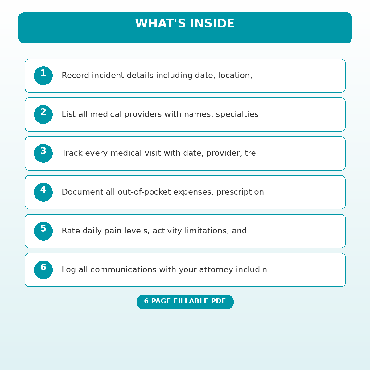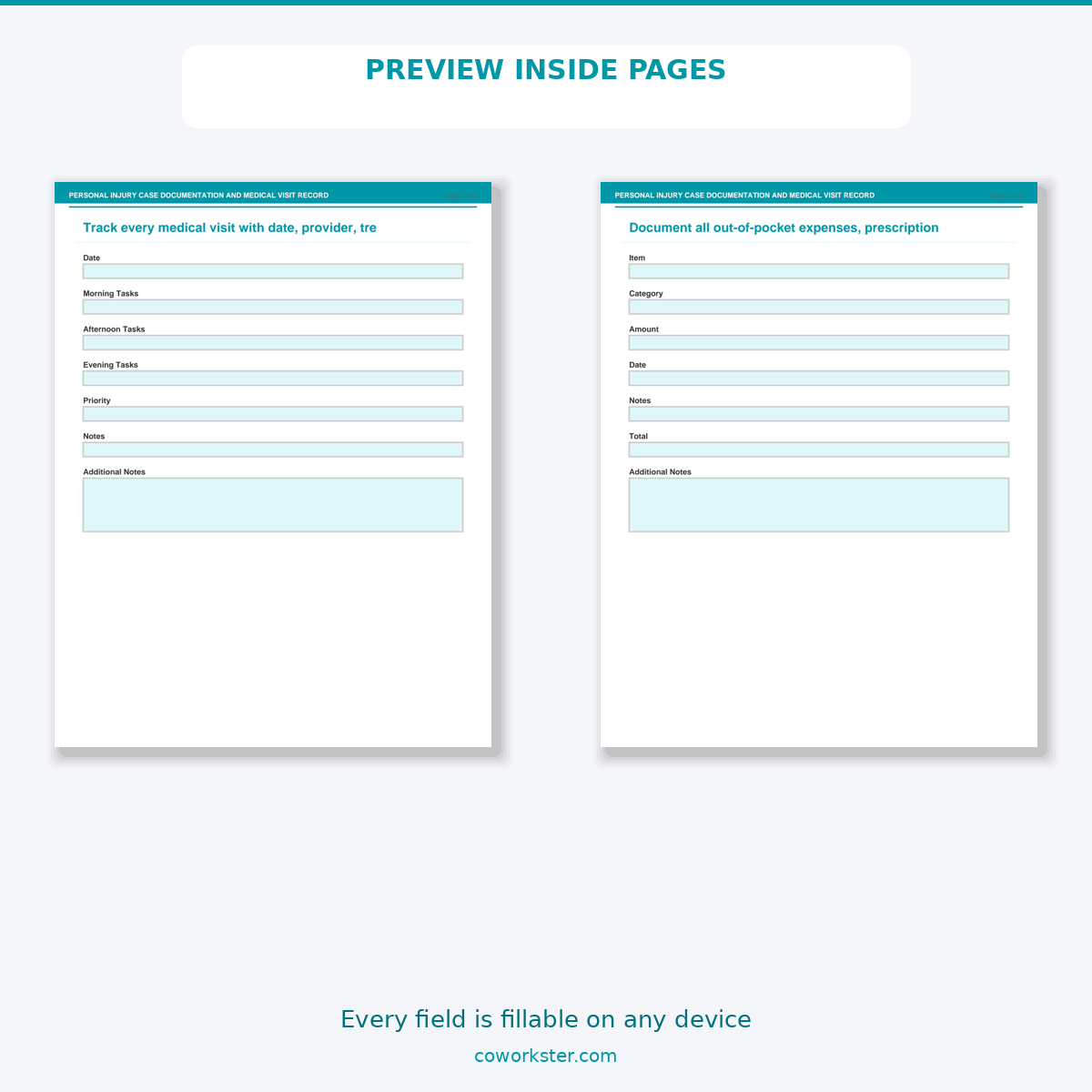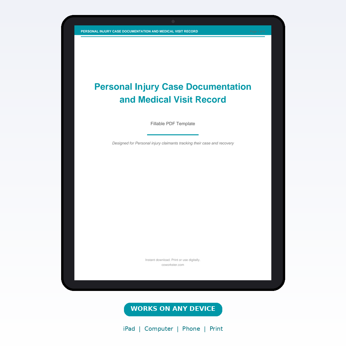 If you have been looking for a personal injury case documentation and medical visit record that actually works the way you need it to, this is it. We designed this 6 page fillable PDF specifically for Personal injury claimants tracking their case and recovery who want something practical, organized, and ready to use right away.