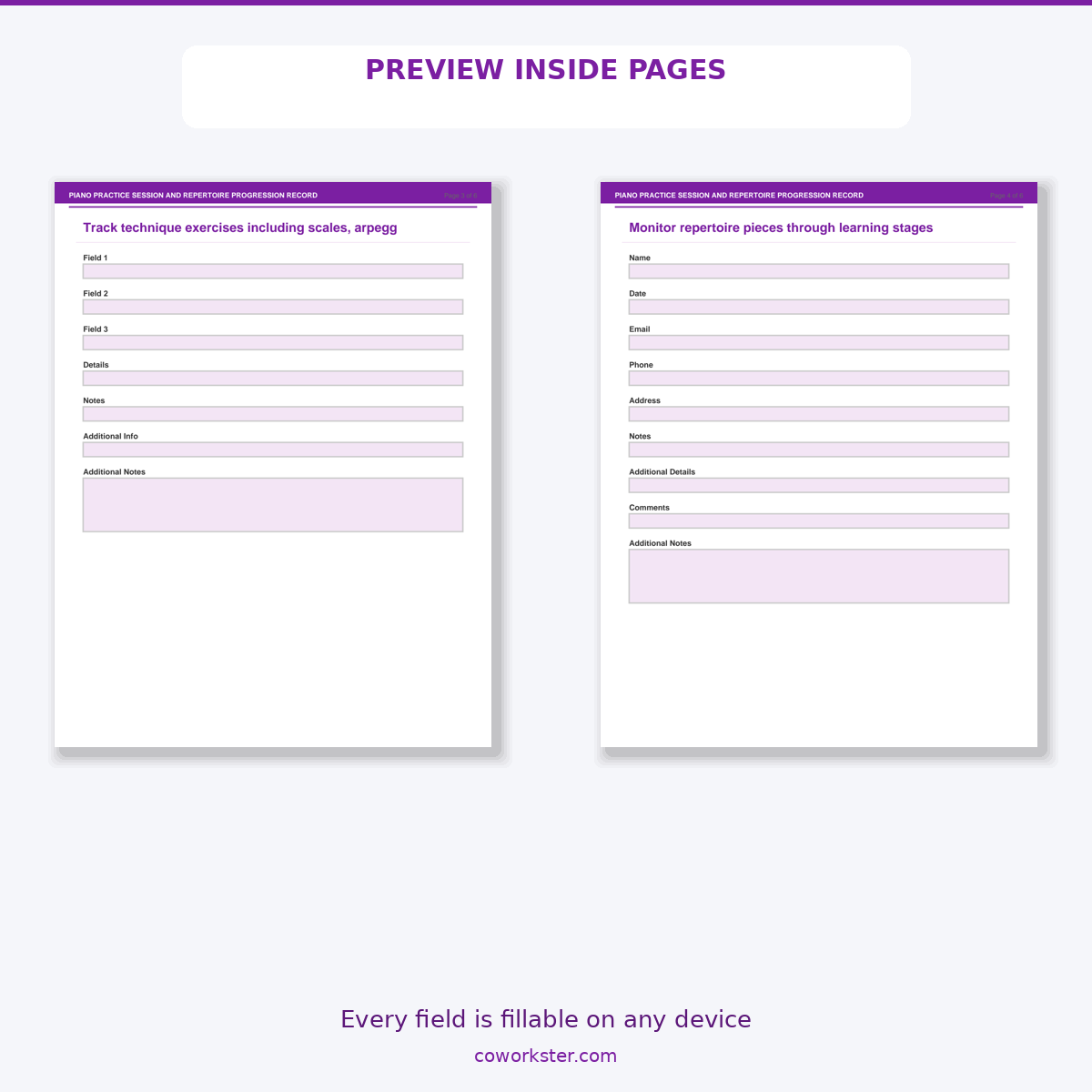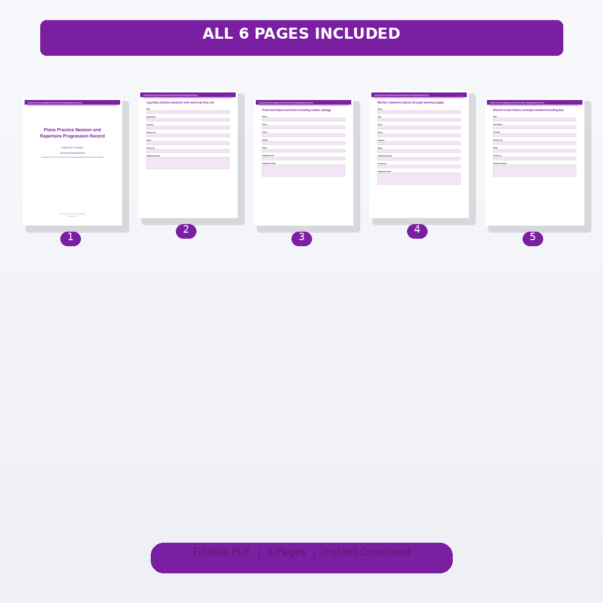 A [‘Current Skill Assessment’, ‘Daily Practice Log’, ‘Technique Exercise Record’, ‘Repertoire Progress Tracker’, ‘Theory Study Notes’, ‘Recital and Performance Prep’] page fillable PDF template designed for Piano students and self-taught pianists tracking their progress. Covers everything you need in one organized, professional document. Just open it, fill in the fields, and you are ready to go. Works on any device or print it out.