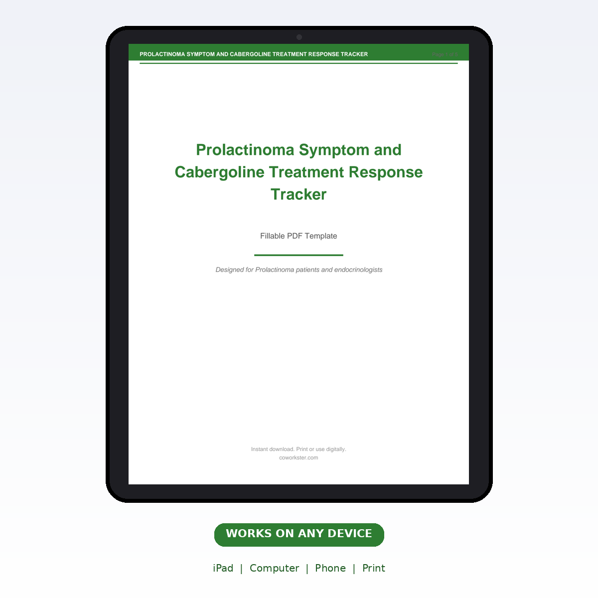 If you have been looking for a prolactinoma symptom and cabergoline treatment response tracker that actually works the way you need it to, this is it. We designed this 5 page fillable PDF specifically for Prolactinoma patients and endocrinologists who want something practical, organized, and ready to use right away.