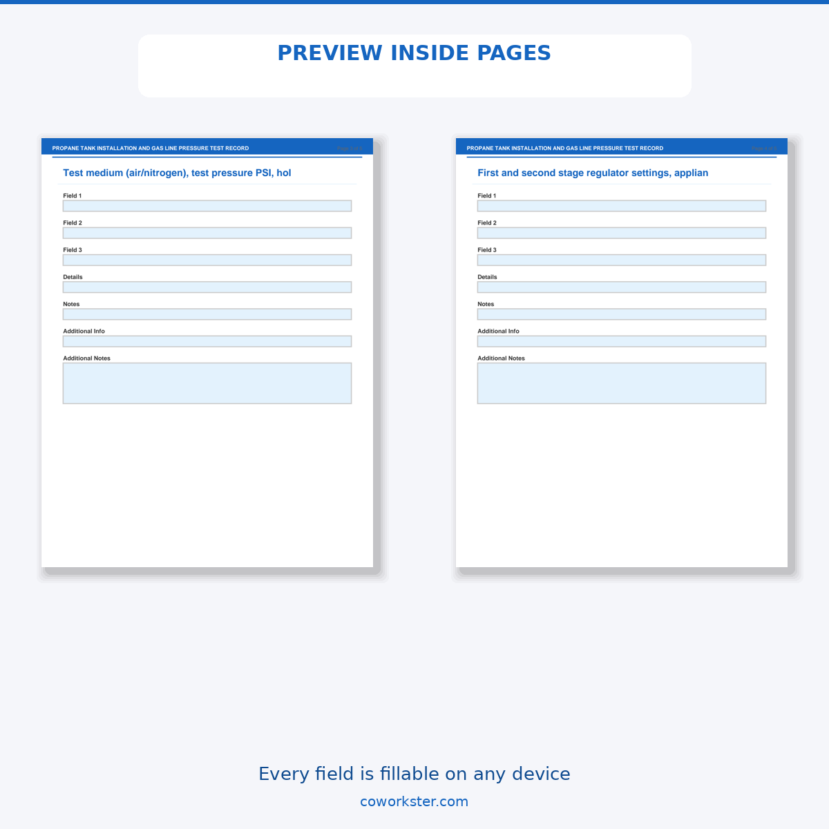 If you have been looking for a propane tank installation and gas line pressure test record that actually works the way you need it to, this is it. We designed this 5 page fillable PDF specifically for Propane service technicians and rural homeowners who want something practical, organized, and ready to use right away.