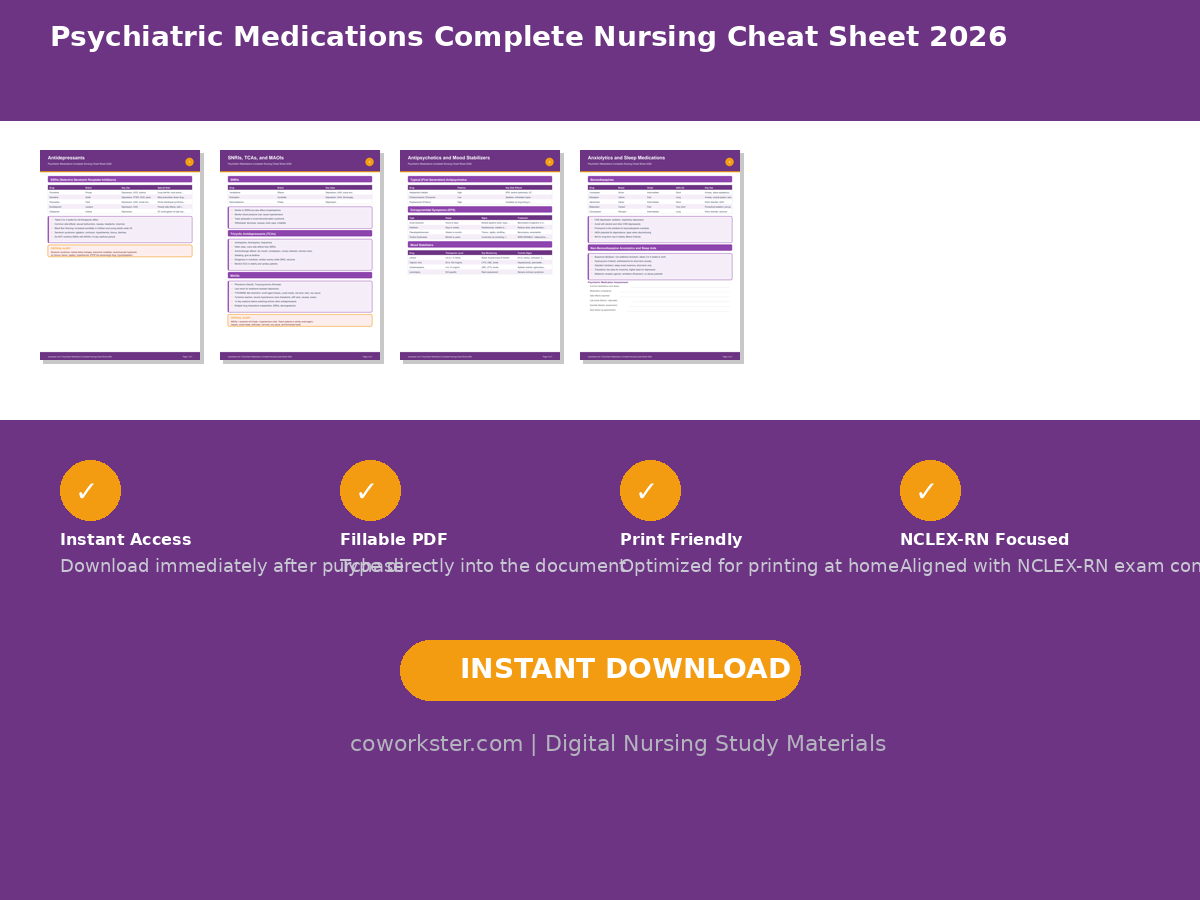 Studying for NCLEX-RN can feel overwhelming, but having the right study materials makes all the difference. This cheat sheet was created specifically for nursing students studying psychiatric pharmacology who want a clear, organized, and comprehensive resource they can actually use. Whether you are reviewing for the first time or doing a final cram session, this 4 page fillable PDF gives you exactly what you need in one place.