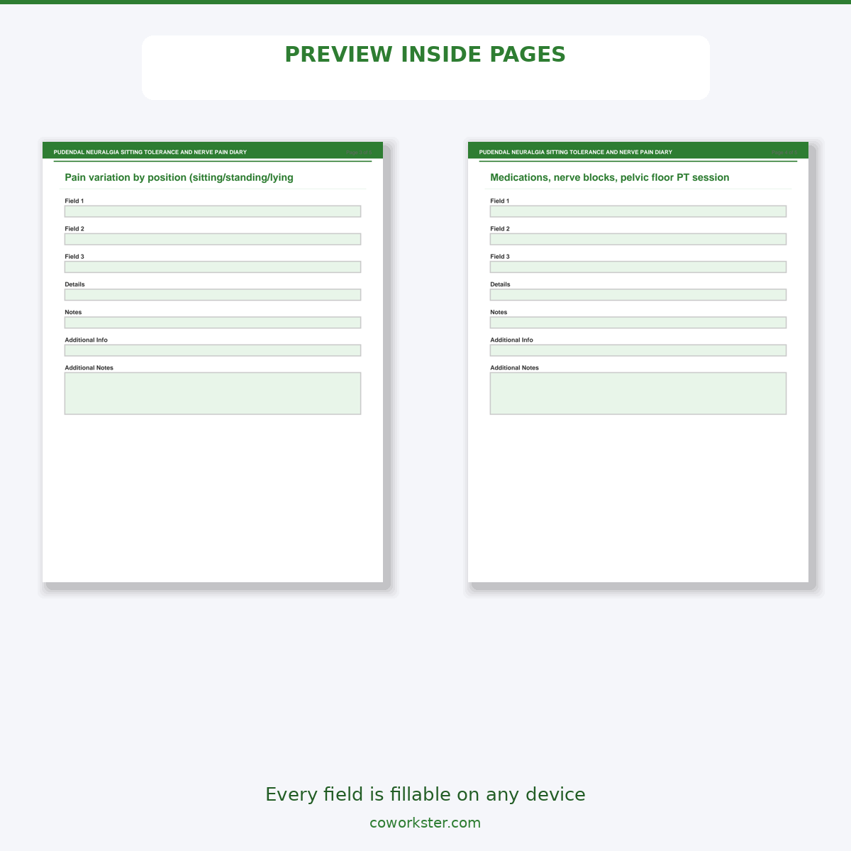 If you have been looking for a pudendal neuralgia sitting tolerance and nerve pain diary that actually works the way you need it to, this is it. We designed this 5 page fillable PDF specifically for Pudendal neuralgia patients and pelvic pain specialists who want something practical, organized, and ready to use right away.
