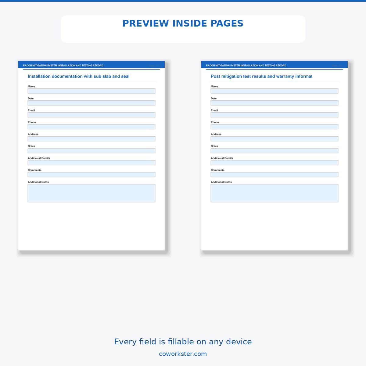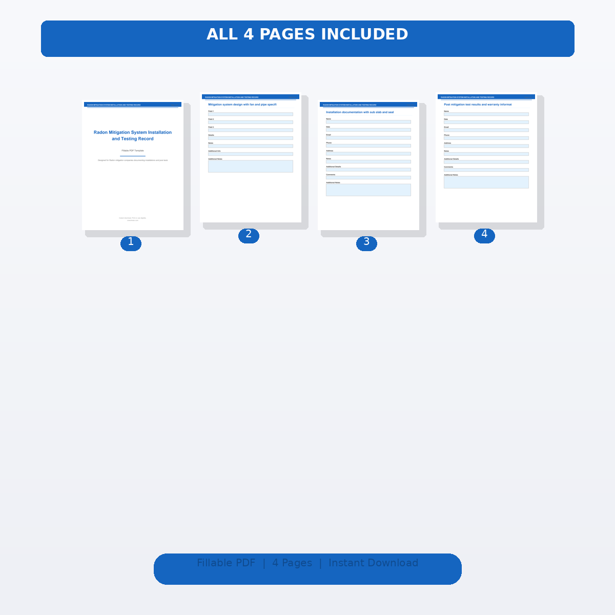 If you have been looking for a radon mitigation system installation and testing record that actually works the way you need it to, this is it. We designed this 4 page fillable PDF specifically for Radon mitigation companies documenting installations and post tests who want something practical, organized, and ready to use right away.