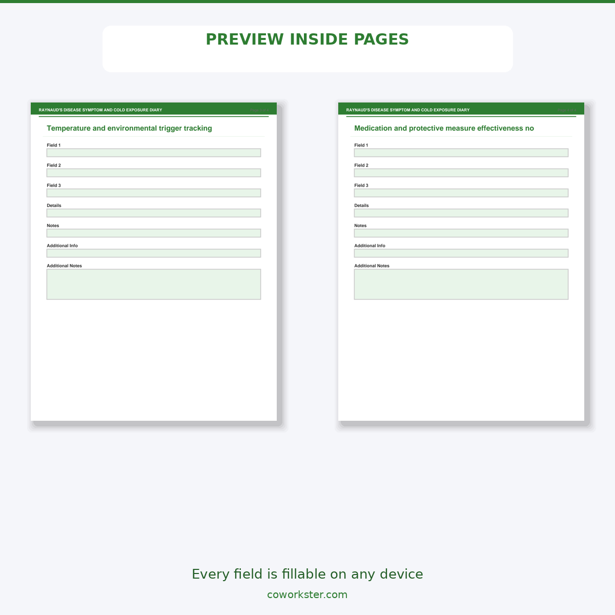 A 4 page fillable PDF template designed for People with Raynaud’s phenomenon tracking attacks and triggers. Covers everything you need in one organized, professional document. Just open it, fill in the fields, and you are ready to go. Works on any device or print it out.