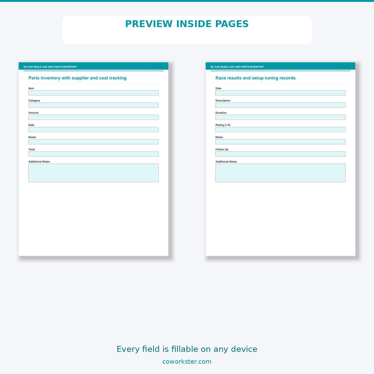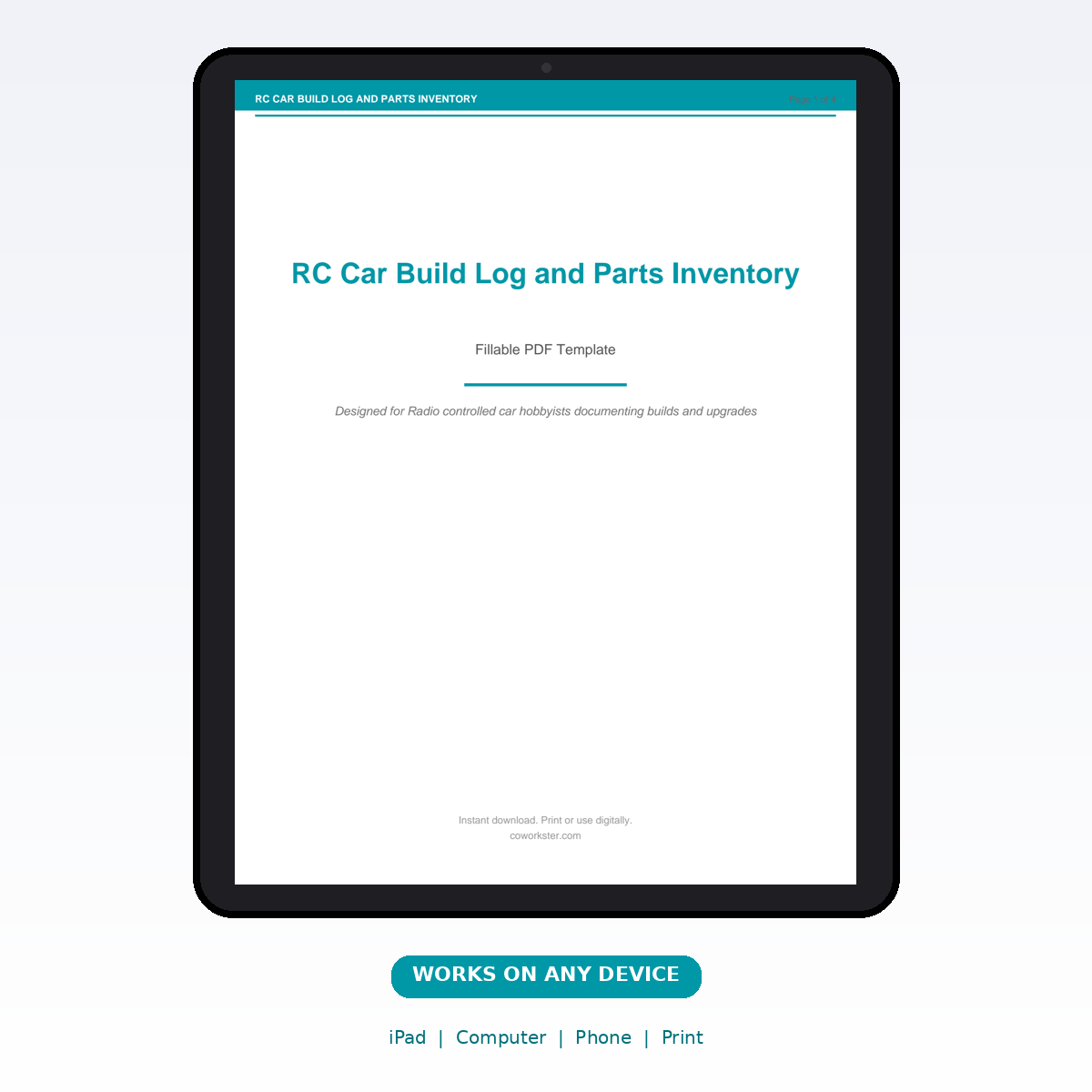 If you have been looking for a rc car build log and parts inventory that actually works the way you need it to, this is it. We designed this 4 page fillable PDF specifically for Radio controlled car hobbyists documenting builds and upgrades who want something practical, organized, and ready to use right away.