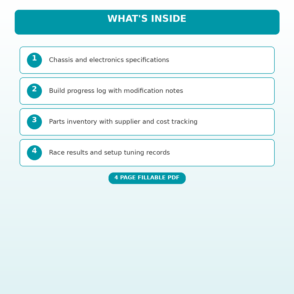 A 4 page fillable PDF template designed for Radio controlled car hobbyists documenting builds and upgrades. Covers everything you need in one organized, professional document. Just open it, fill in the fields, and you are ready to go. Works on any device or print it out.