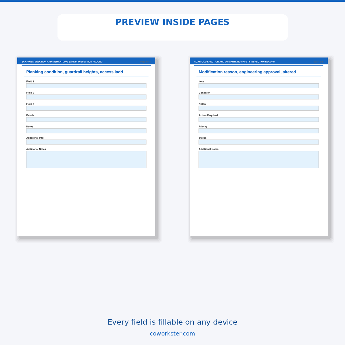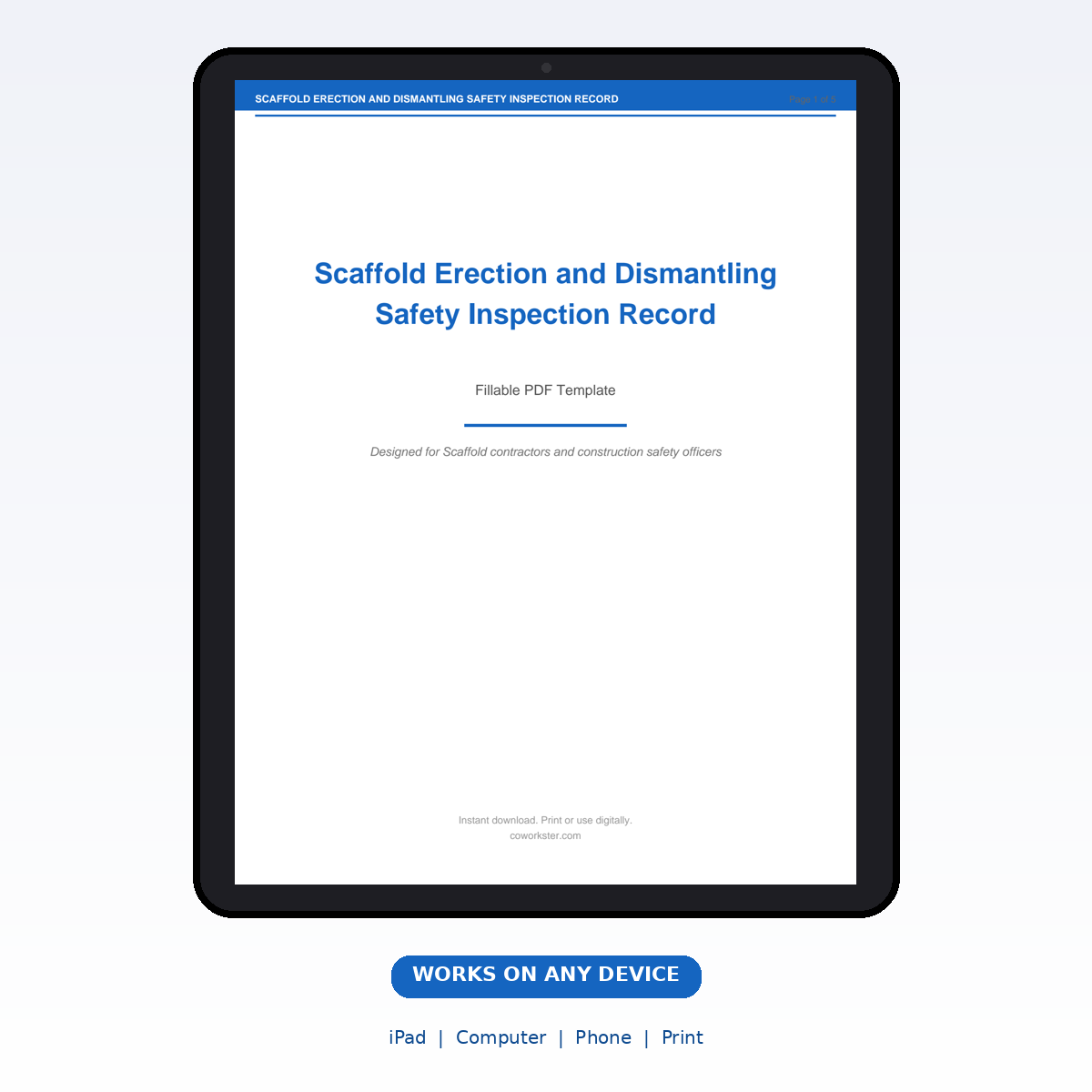 If you have been looking for a scaffold erection and dismantling safety inspection record that actually works the way you need it to, this is it. We designed this 5 page fillable PDF specifically for Scaffold contractors and construction safety officers who want something practical, organized, and ready to use right away.