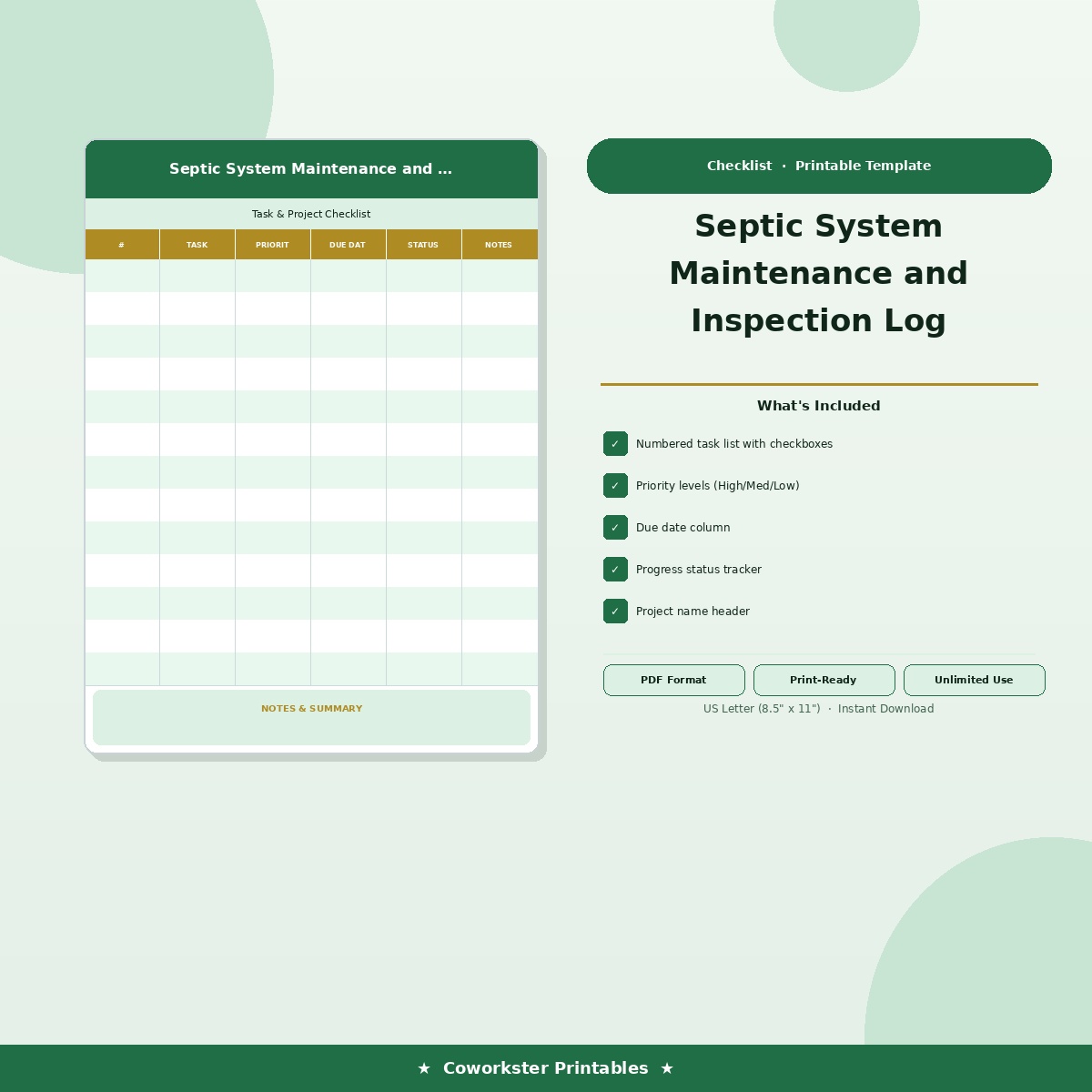 This template was built for Rural homeowners maintaining septic systems and scheduling pumping. Whether you are just getting started or have been at it for years, having a proper system saves you time and keeps everything in one place. No more scattered notes, forgotten details, or reinventing the wheel every time.