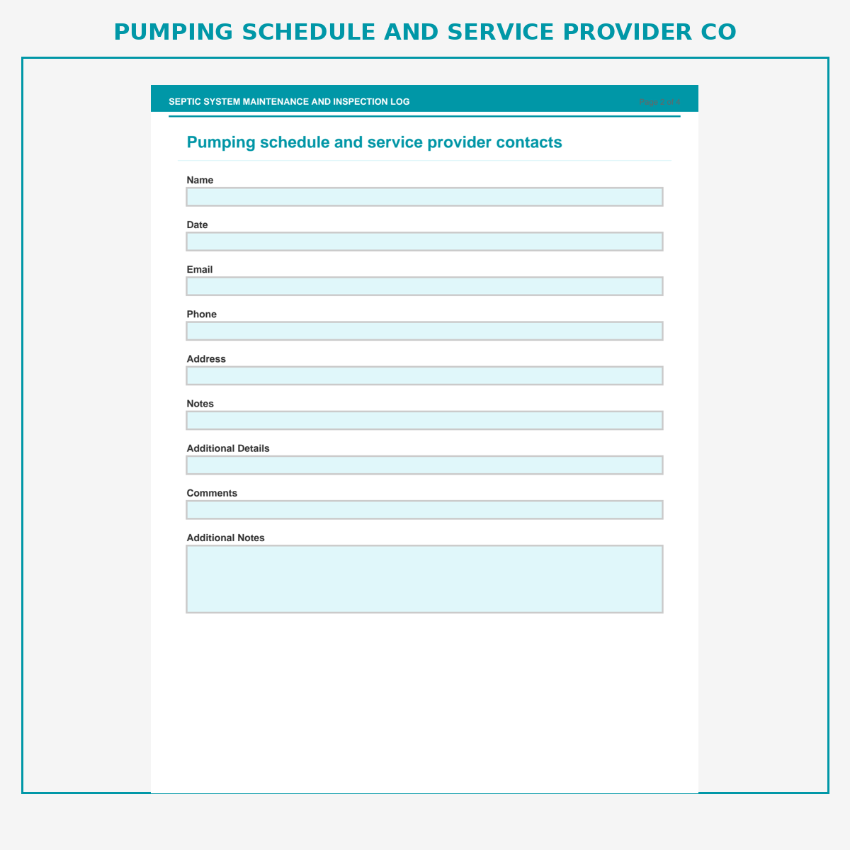 Pumping schedule and service provider contacts