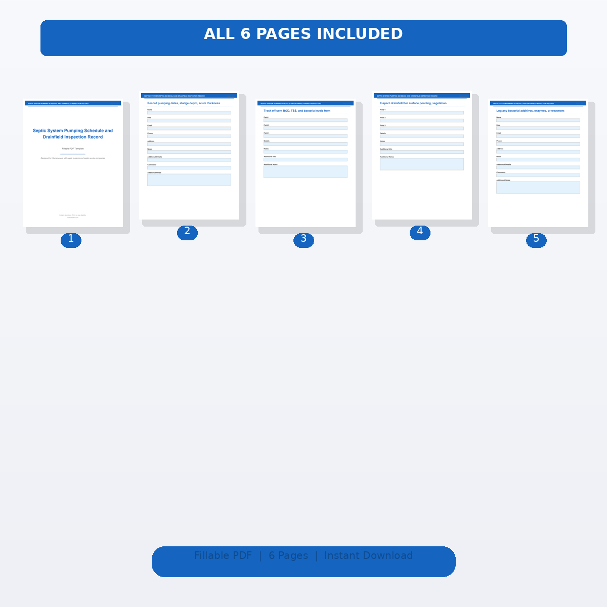 If you have been looking for a septic system pumping schedule and drainfield inspection record that actually works the way you need it to, this is it. We designed this 6 page fillable PDF specifically for Homeowners with septic systems and septic service companies who want something practical, organized, and ready to use right away.