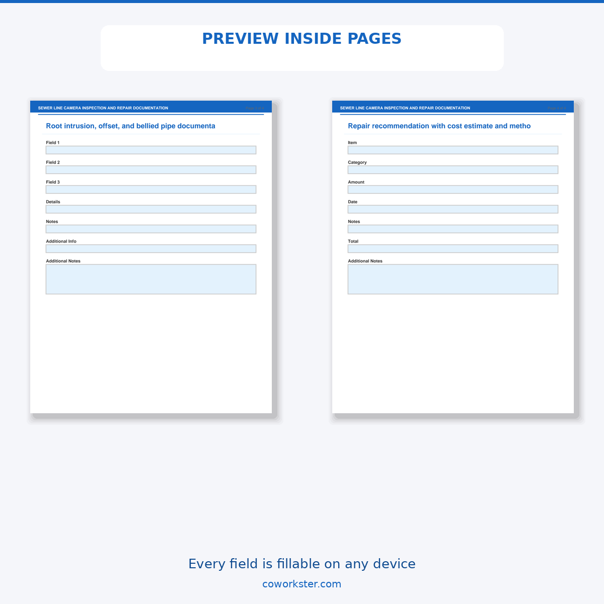 If you have been looking for a sewer line camera inspection and repair documentation that actually works the way you need it to, this is it. We designed this 4 page fillable PDF specifically for Plumbers documenting sewer camera inspections and recommending repairs who want something practical, organized, and ready to use right away.