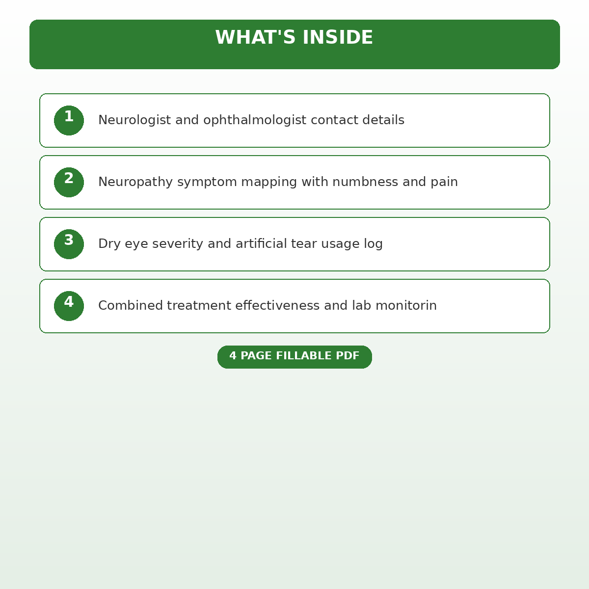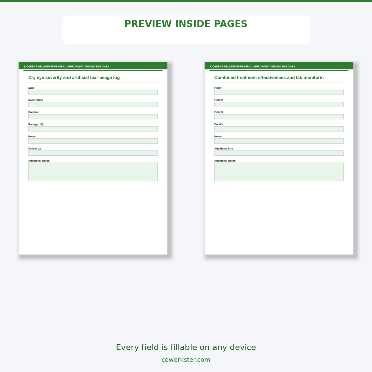 If you have been looking for a sjögren’s related peripheral neuropathy and dry eye diary that actually works the way you need it to, this is it. We designed this 4 page fillable PDF specifically for Sjögren’s patients with neuropathy tracking combined symptom burden who want something practical, organized, and ready to use right away.