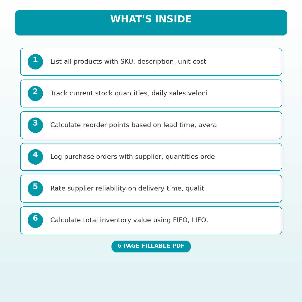 If you have been looking for a small business inventory reorder point and stock level tracker that actually works the way you need it to, this is it. We designed this 6 page fillable PDF specifically for Small business owners managing physical inventory who want something practical, organized, and ready to use right away.