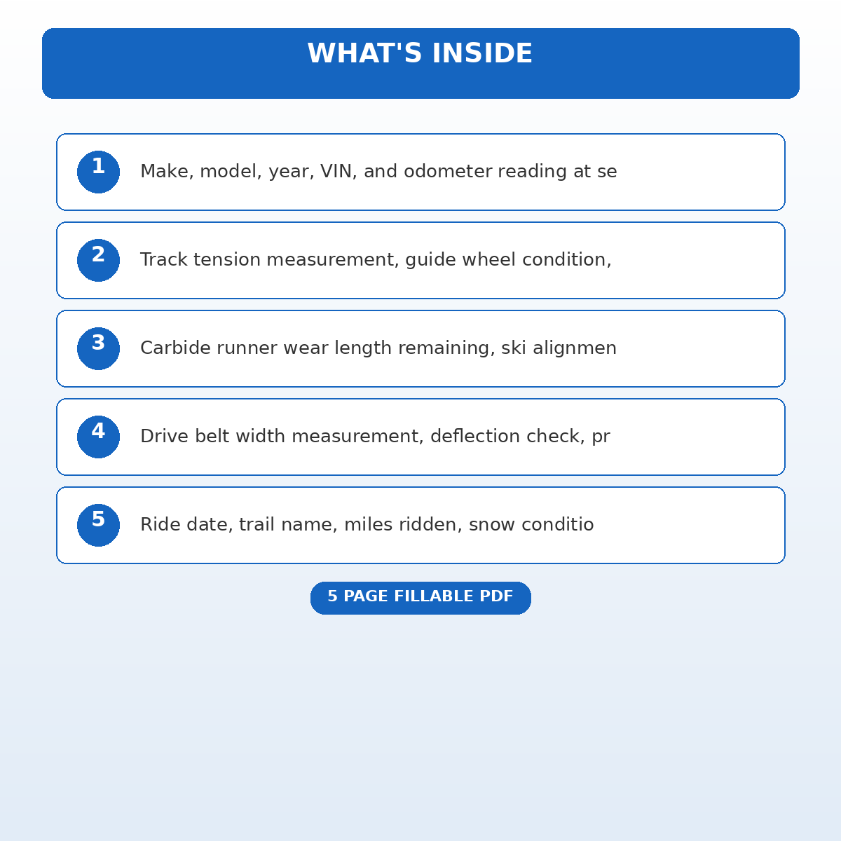 If you have been looking for a snowmobile pre-season inspection and trail mileage log that actually works the way you need it to, this is it. We designed this 5 page fillable PDF specifically for Snowmobile owners and sled service technicians who want something practical, organized, and ready to use right away.