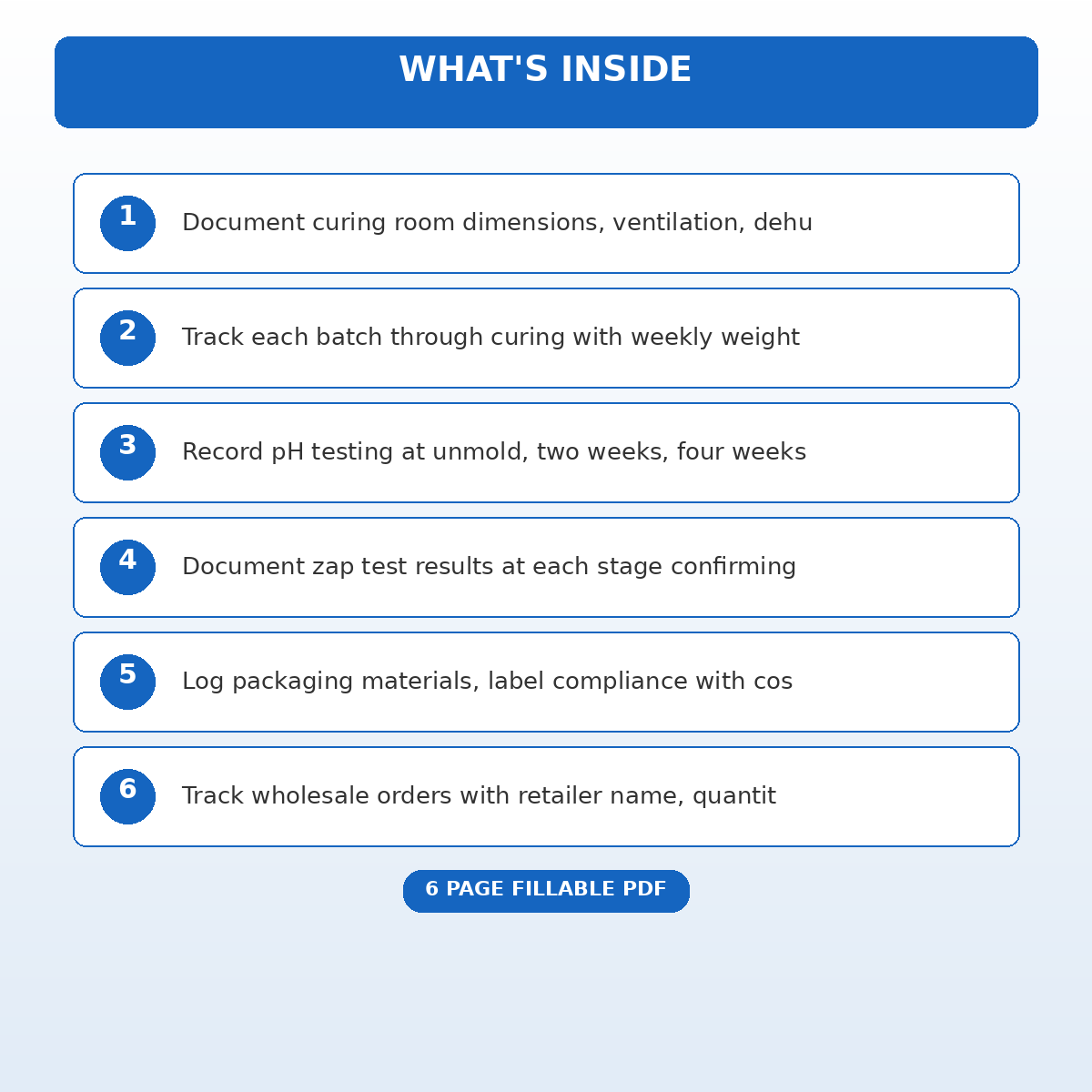 If you have been looking for a soap curing room humidity control and batch quality record that actually works the way you need it to, this is it. We designed this 6 page fillable PDF specifically for Handmade soap business owners managing production quality who want something practical, organized, and ready to use right away.