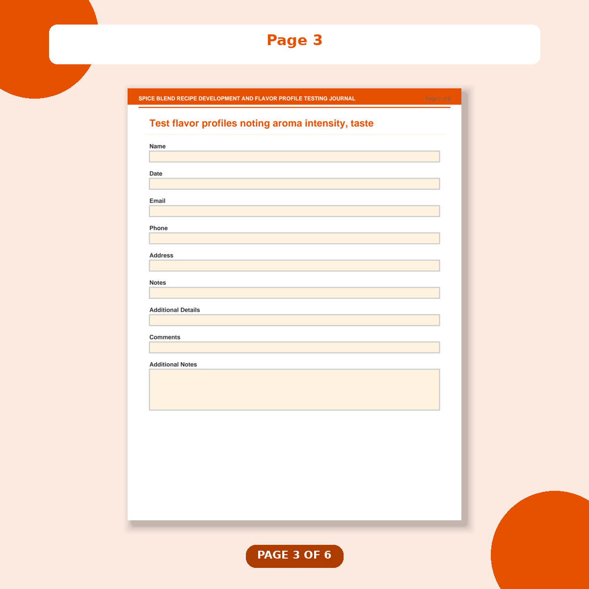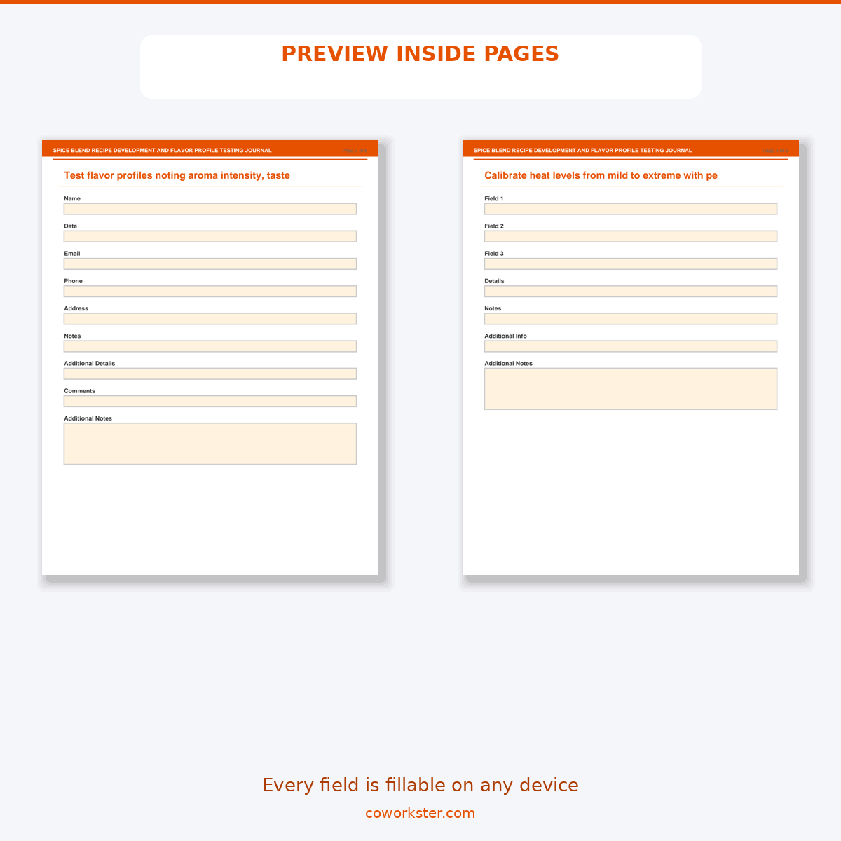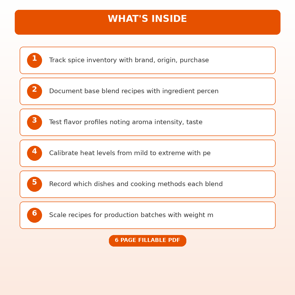 A [‘Spice Inventory Record’, ‘Base Blend Formulas’, ‘Flavor Profile Testing’, ‘Heat Level Calibration’, ‘Recipe Application Notes’, ‘Production Batch Record’] page fillable PDF template designed for Home cooks and spice blend artisans developing custom seasonings. Covers everything you need in one organized, professional document. Just open it, fill in the fields, and you are ready to go. Works on any device or print it out.