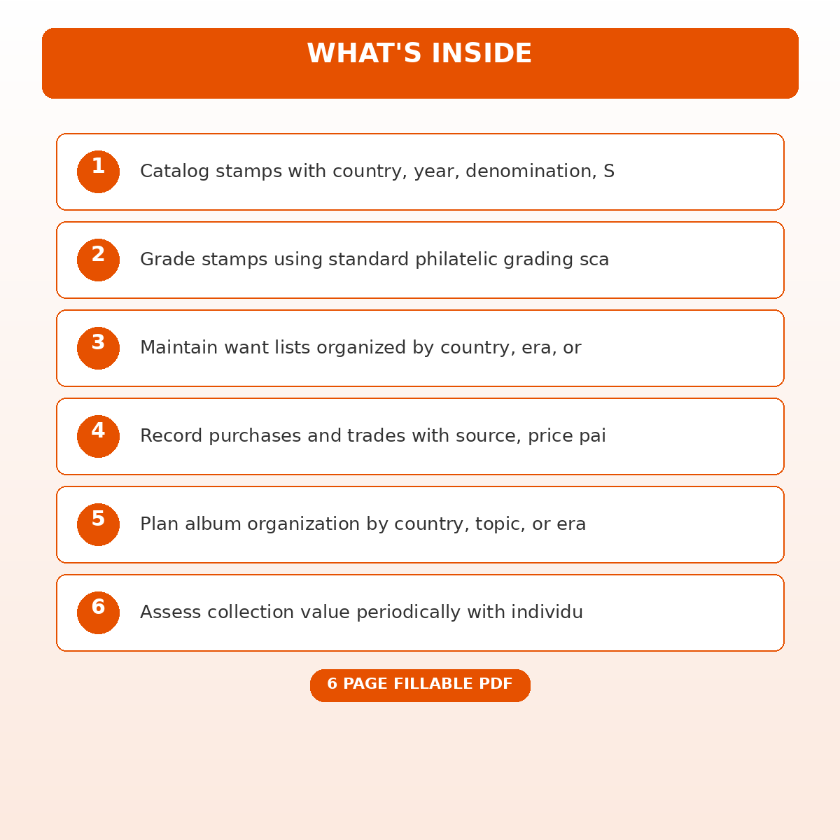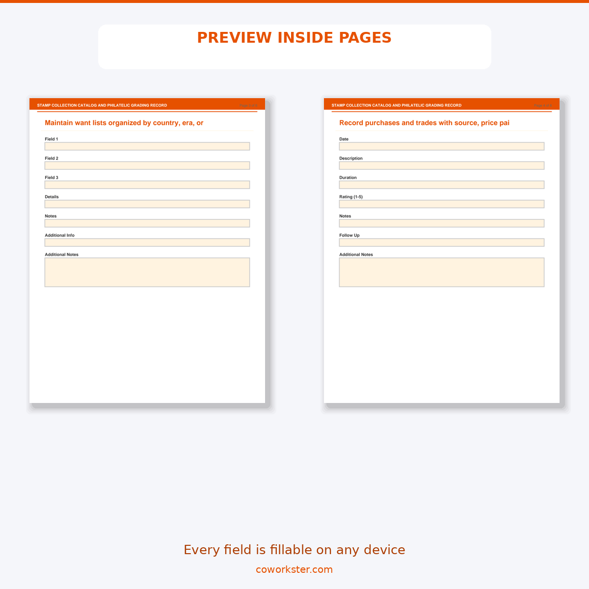 If you have been looking for a stamp collection catalog and philatelic grading record that actually works the way you need it to, this is it. We designed this 6 page fillable PDF specifically for Stamp collectors and philatelic enthusiasts who want something practical, organized, and ready to use right away.