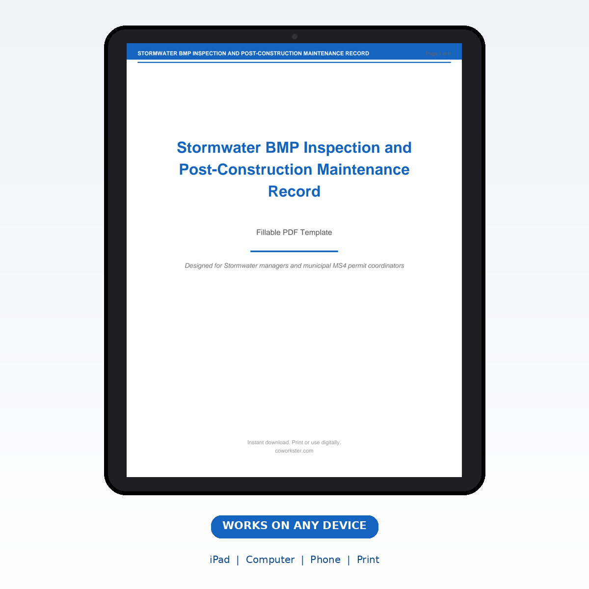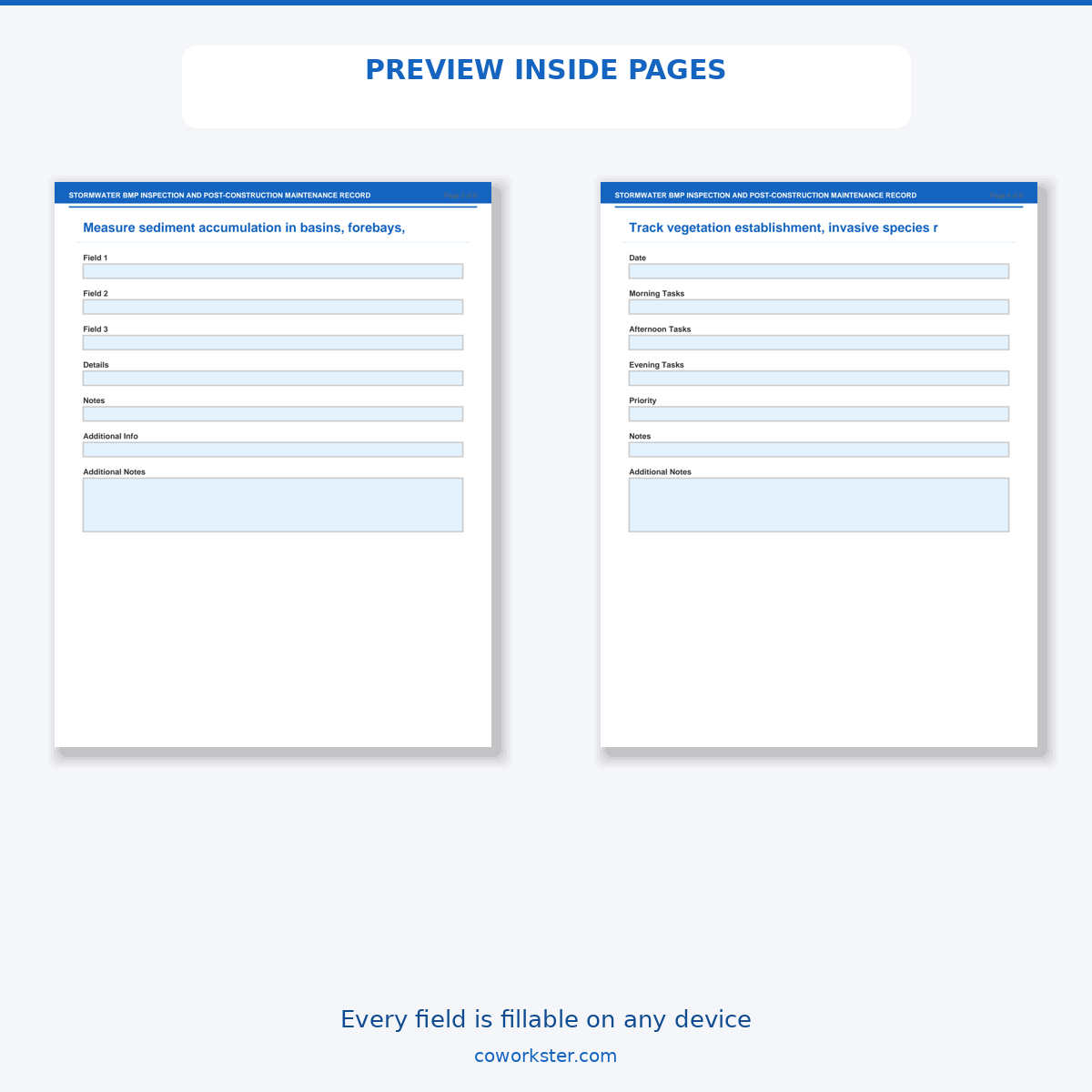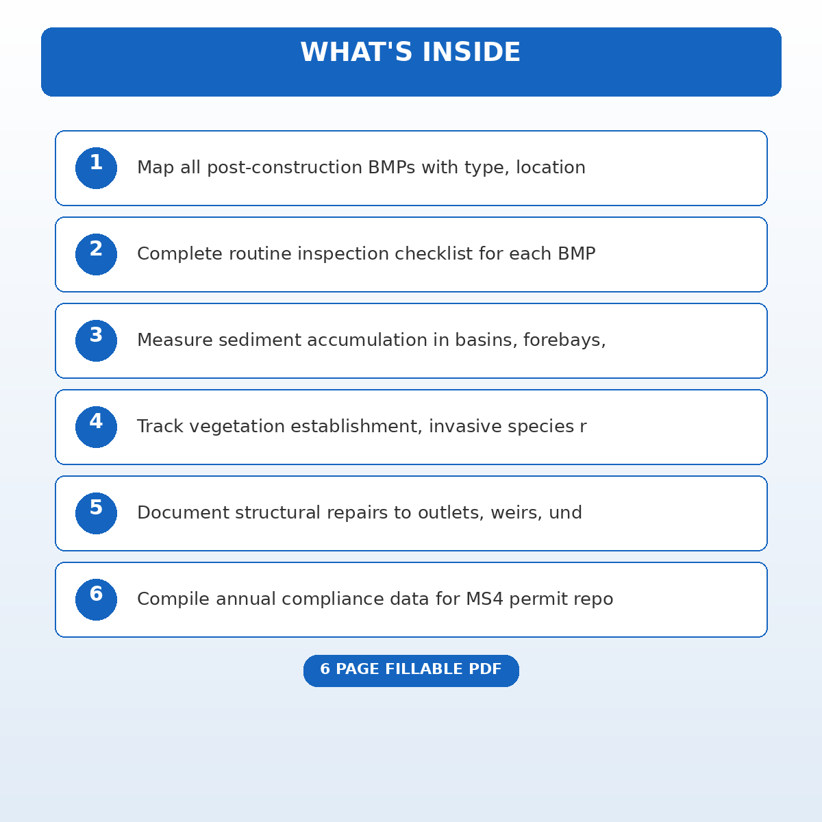 A [‘BMP Inventory Map’, ‘Routine Inspection Checklist’, ‘Sediment Accumulation Assessment’, ‘Vegetation Management Record’, ‘Structural Repair Documentation’, ‘Annual Compliance Report Data’] page fillable PDF template designed for Stormwater managers and municipal MS4 permit coordinators. Covers everything you need in one organized, professional document. Just open it, fill in the fields, and you are ready to go. Works on any device or print it out.