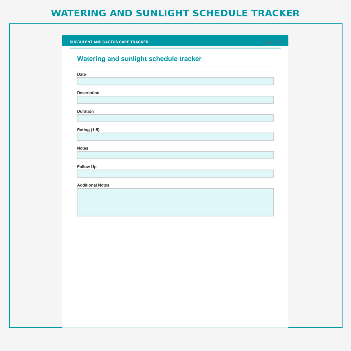 A 4 page fillable PDF template designed for Succulent collectors tracking watering schedules and plant health. Covers everything you need in one organized, professional document. Just open it, fill in the fields, and you are ready to go. Works on any device or print it out.