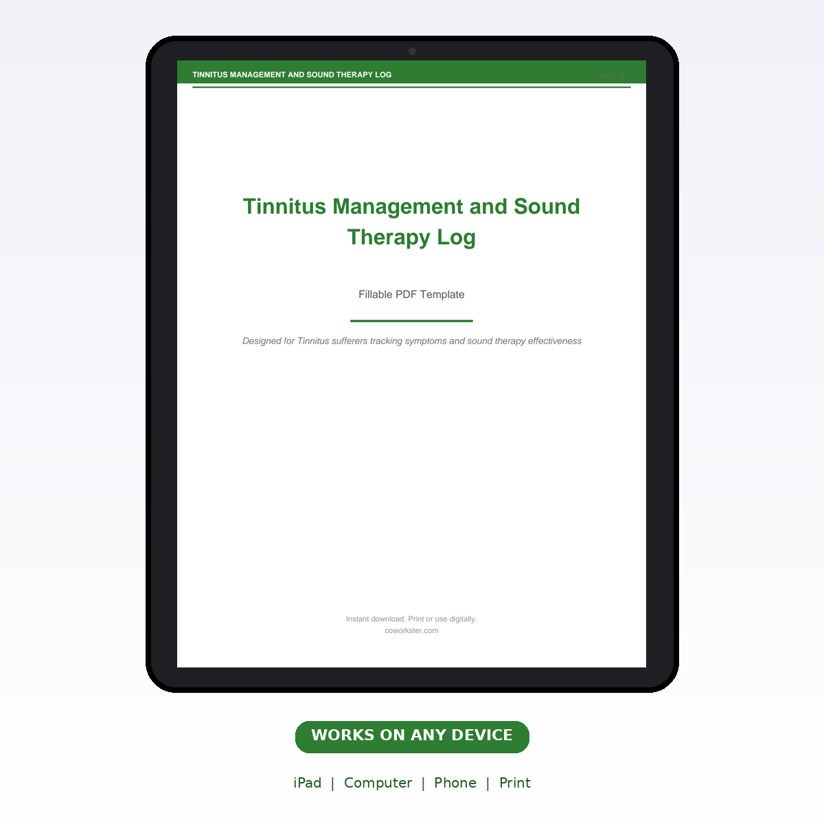 If you have been looking for a tinnitus management and sound therapy log that actually works the way you need it to, this is it. We designed this 4 page fillable PDF specifically for Tinnitus sufferers tracking symptoms and sound therapy effectiveness who want something practical, organized, and ready to use right away.