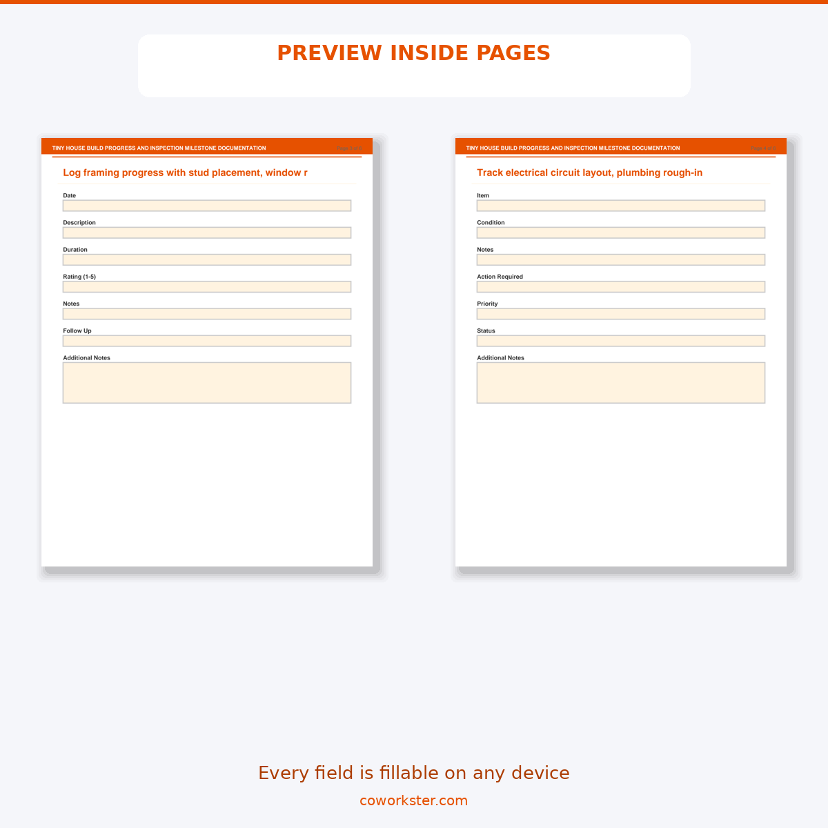 If you have been looking for a tiny house build progress and inspection milestone documentation that actually works the way you need it to, this is it. We designed this 6 page fillable PDF specifically for Tiny house builders and DIY construction enthusiasts who want something practical, organized, and ready to use right away.