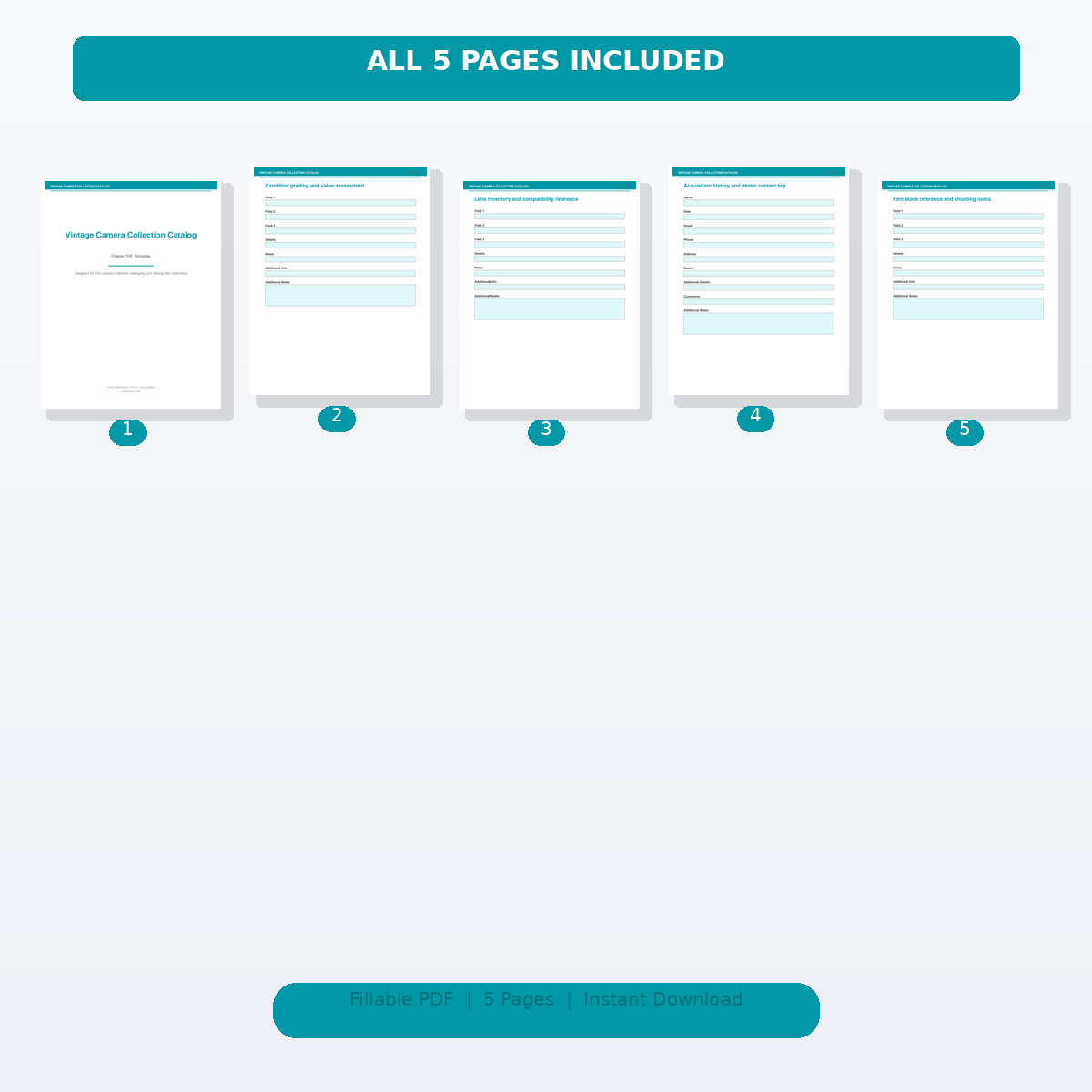 If you have been looking for a vintage camera collection catalog that actually works the way you need it to, this is it. We designed this 5 page fillable PDF specifically for Film camera collectors cataloging and valuing their collections who want something practical, organized, and ready to use right away.