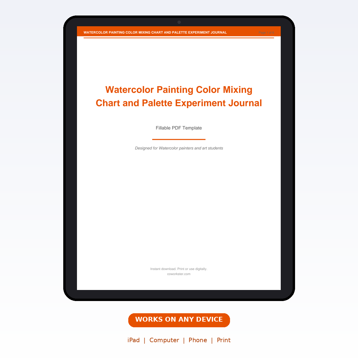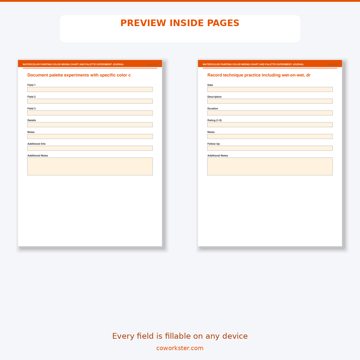 A [‘Paint Collection Catalog’, ‘Color Mixing Grid’, ‘Palette Experiment Record’, ‘Technique Practice Notes’, ‘Paper and Surface Testing’, ‘Painting Session Journal’] page fillable PDF template designed for Watercolor painters and art students. Covers everything you need in one organized, professional document. Just open it, fill in the fields, and you are ready to go. Works on any device or print it out.