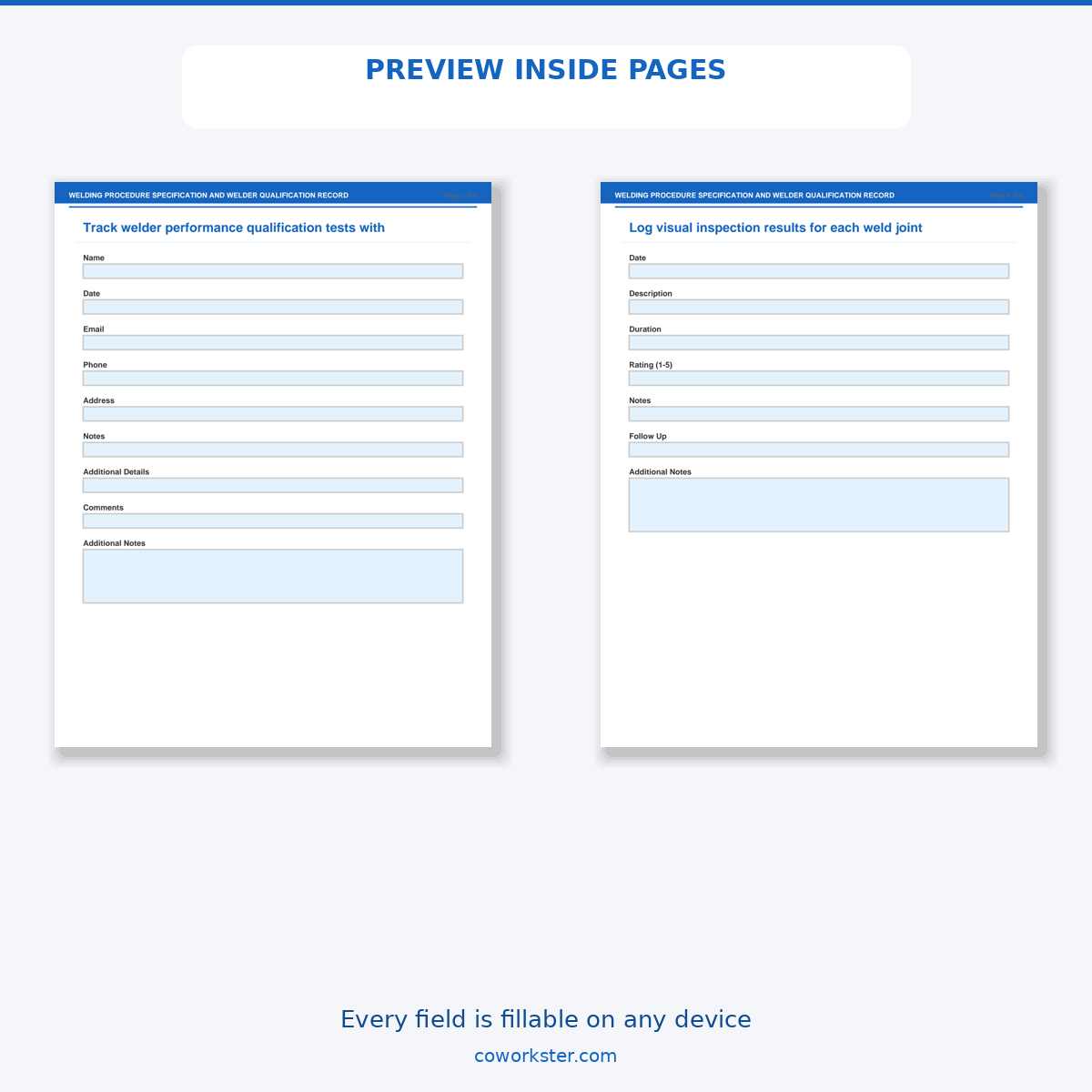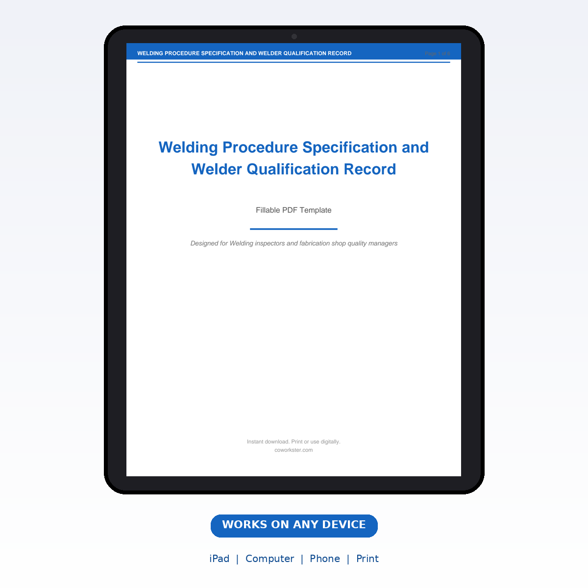 If you have been looking for a welding procedure specification and welder qualification record that actually works the way you need it to, this is it. We designed this 6 page fillable PDF specifically for Welding inspectors and fabrication shop quality managers who want something practical, organized, and ready to use right away.